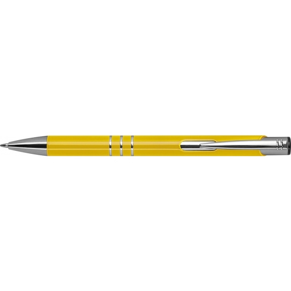 Täielikult lakitud metallist pastapliiats 3 dekoratiivrõnga ja suure mahutavusega sinise kirjaga täidisega. Teie logo graveeritakse klipist paremale.