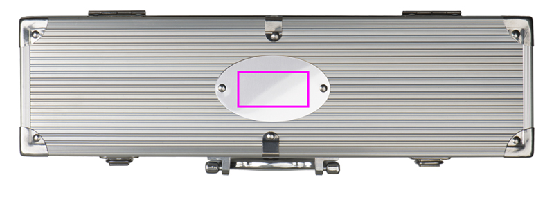Grillkohver, mis koosneb grilltangidest, lihahargist ja grilli keerajast metallist korpuses. Laserime teie logo korpuse ovaalsele metallplaadile.