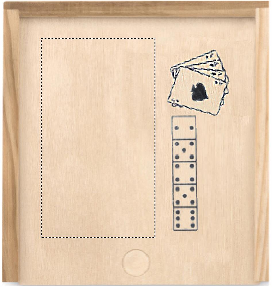 Mängukomplekt 54 kaardi ja 5 täringuga. Esitatakse puidust karbis.