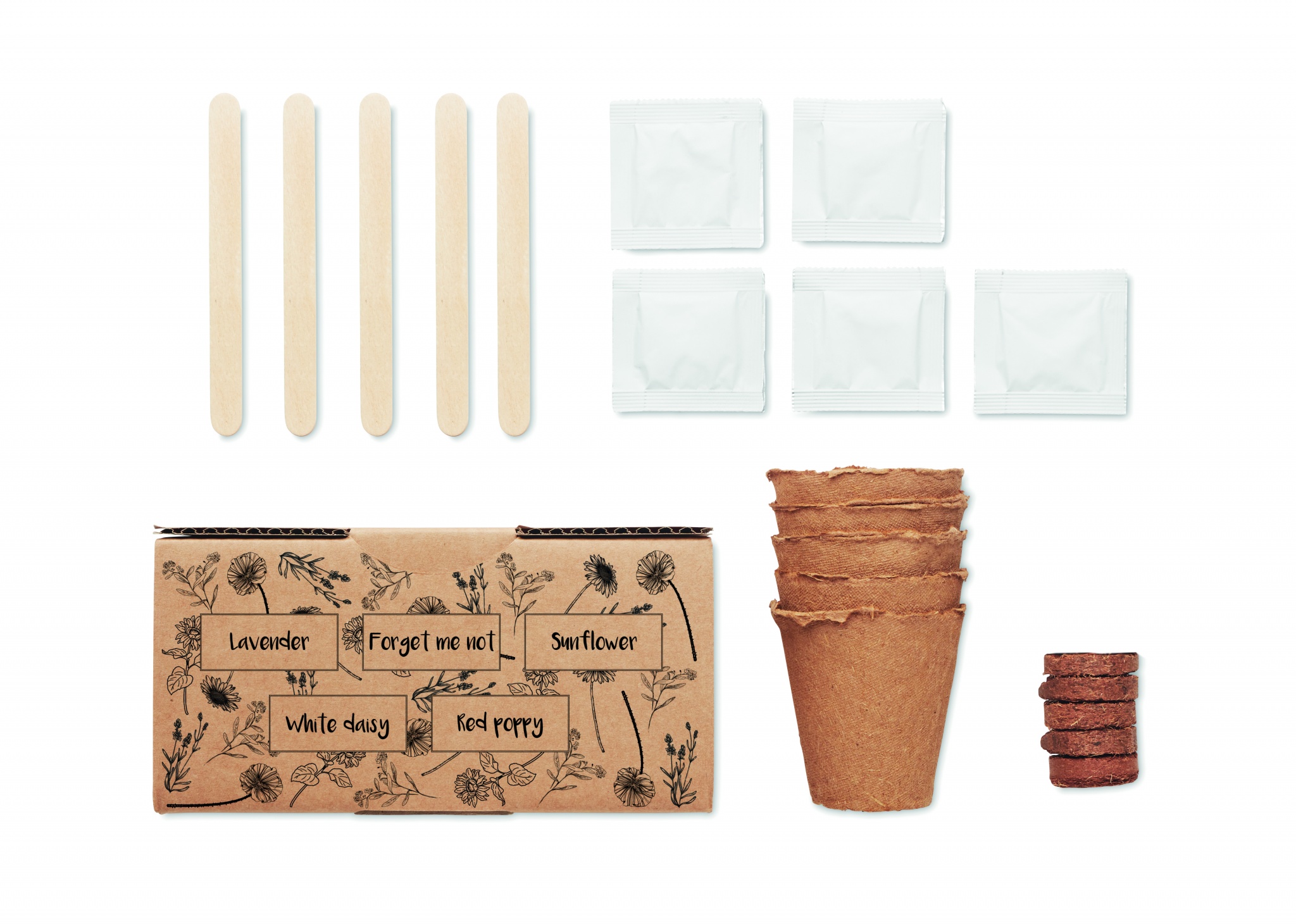 Lillede kasvatamise komplekt. Karp lavendliga, ärge unustage mind, päevalill, valge karikakra ja punased mooniseemned. Valmistatud EL-is. Mullatablett kaasas.