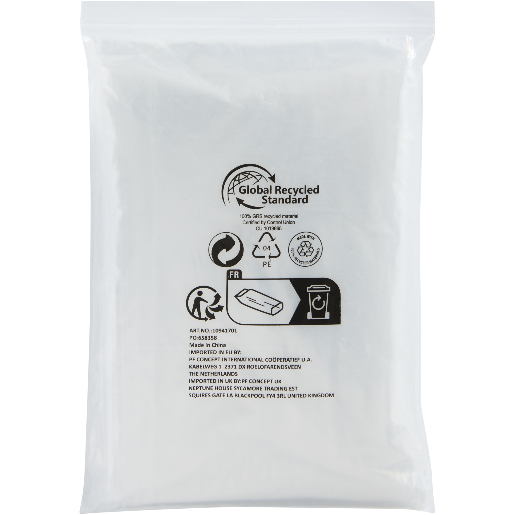Mayan universaalne ühekordne vihmapontšo on valmistatud 100% taaskasutatud plastikust. See läbipaistev kapuutsiga pontšo on ideaalne, kui olete õues toimuva festivali või mõne muu väliürituse ajal vihmatormi käes. Tarnitakse koos trükkimiseks sobiva kotiga. Mõõdud: 90 x 120 cm.