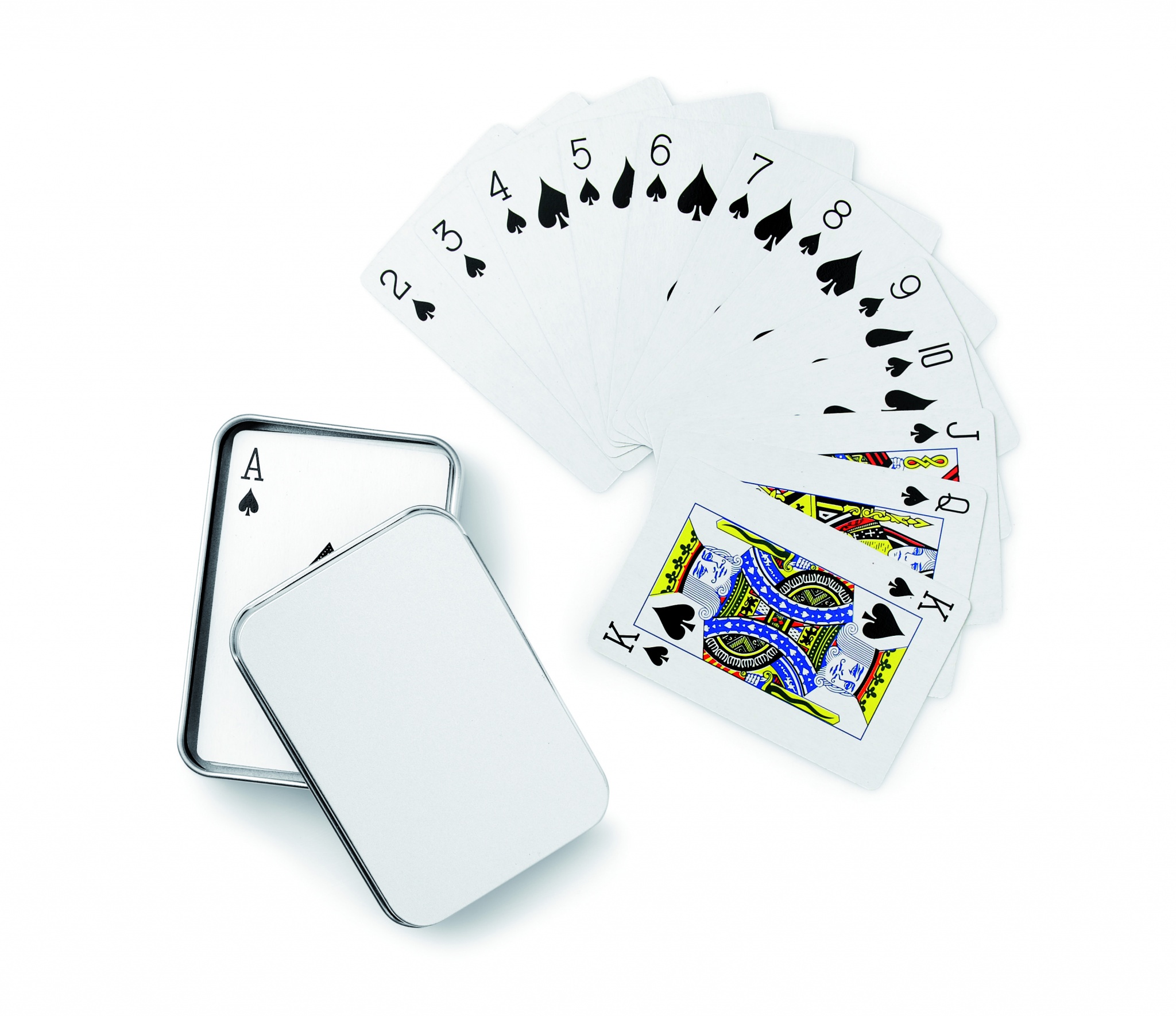 Klassikalised mängukaardid hõbedases plekk-karbis. 54 kaarti.