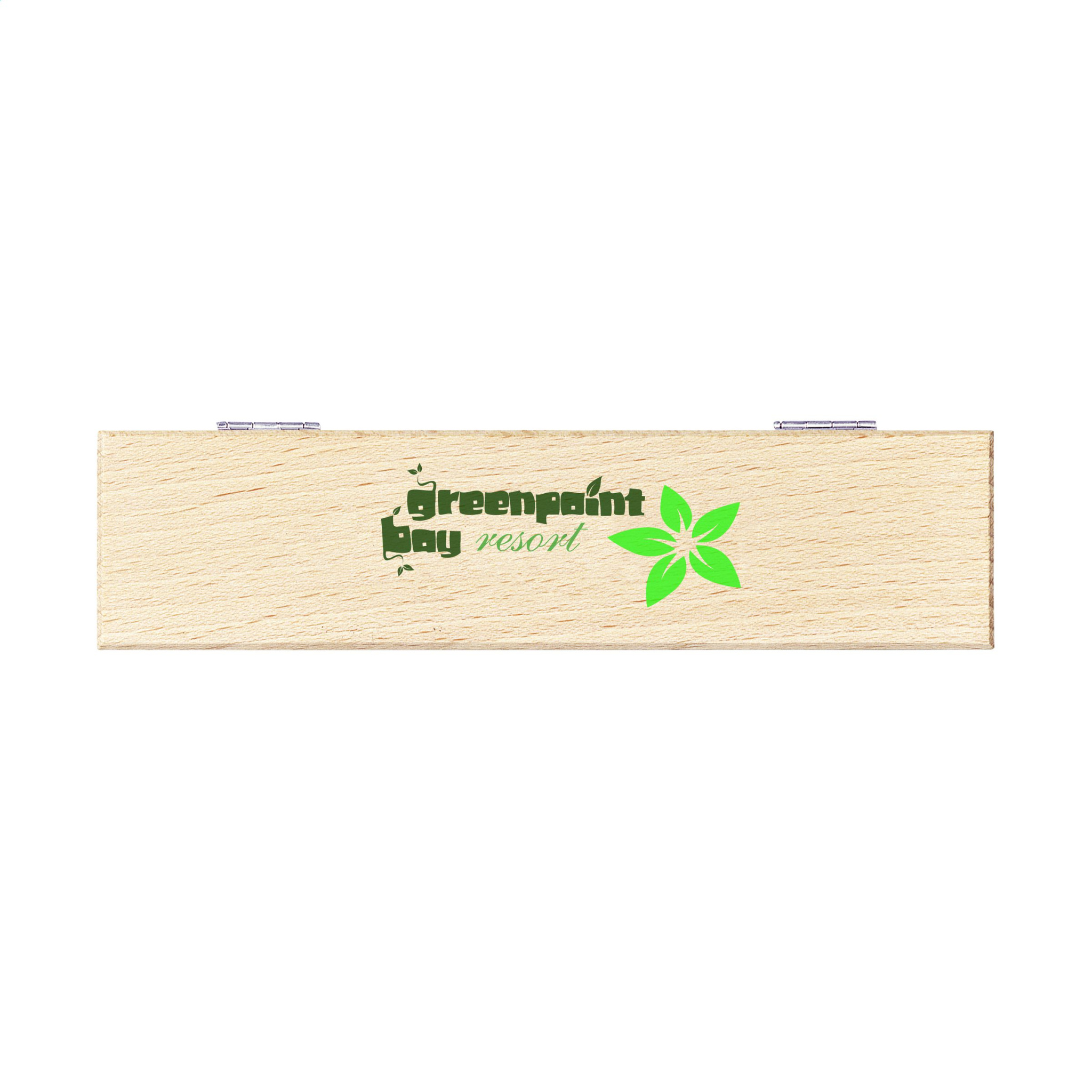 Vau! Pöögipuust kirjutuskomplekt: sinise tindiga pastapliiats ja korduvtäidetav pliiats 3 HB täidisega (0,5 mm). Kroomitud klambri, nupu ja otsaga. Rannas puidust karbis.