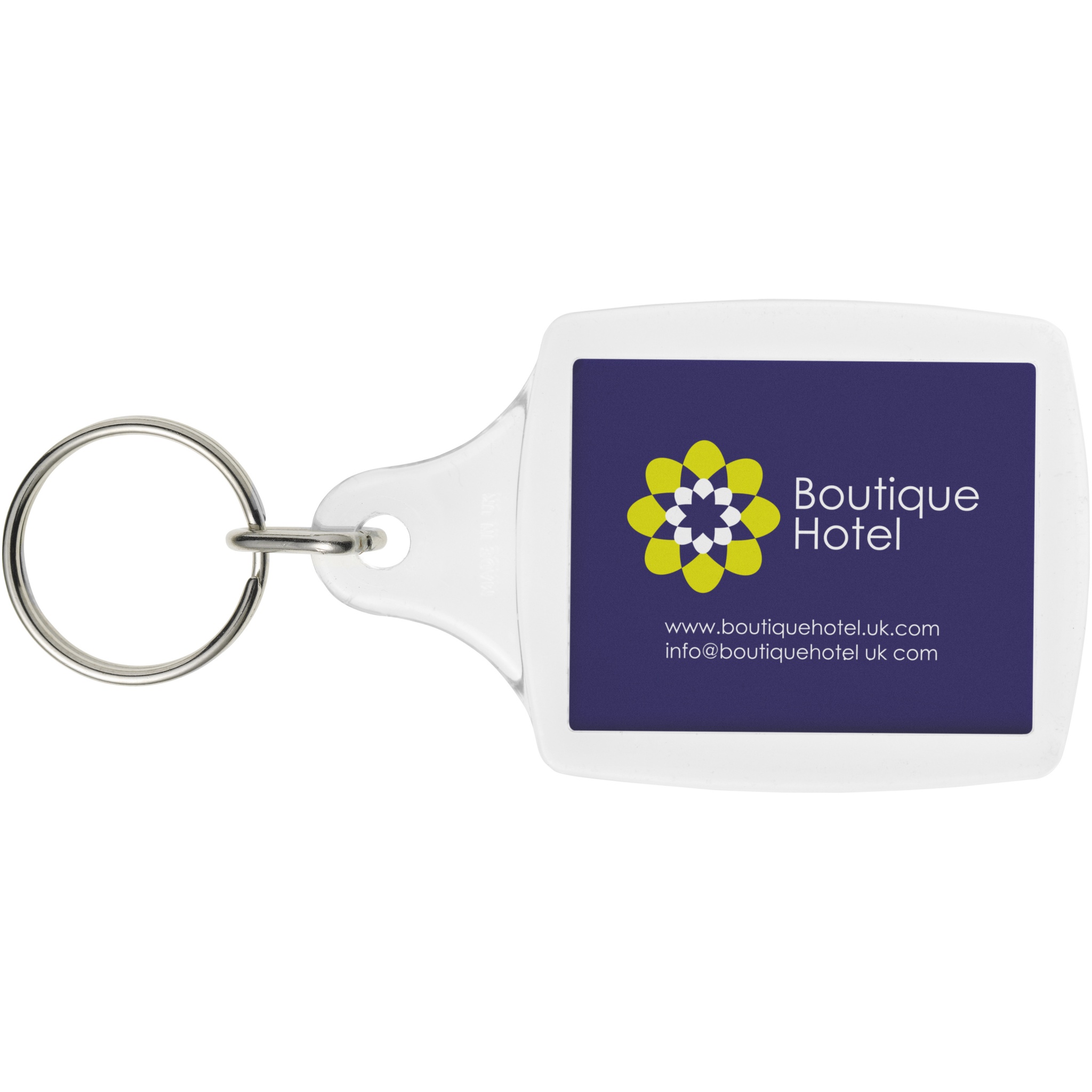 Läbipaistev A5 võtmehoidja metallist poolitatud võtmehoidjaga. Mõeldud kandma pabervahelehte või passifotot. Trükilehe mõõdud: 4,5 cm x 3,5 cm.