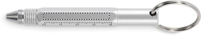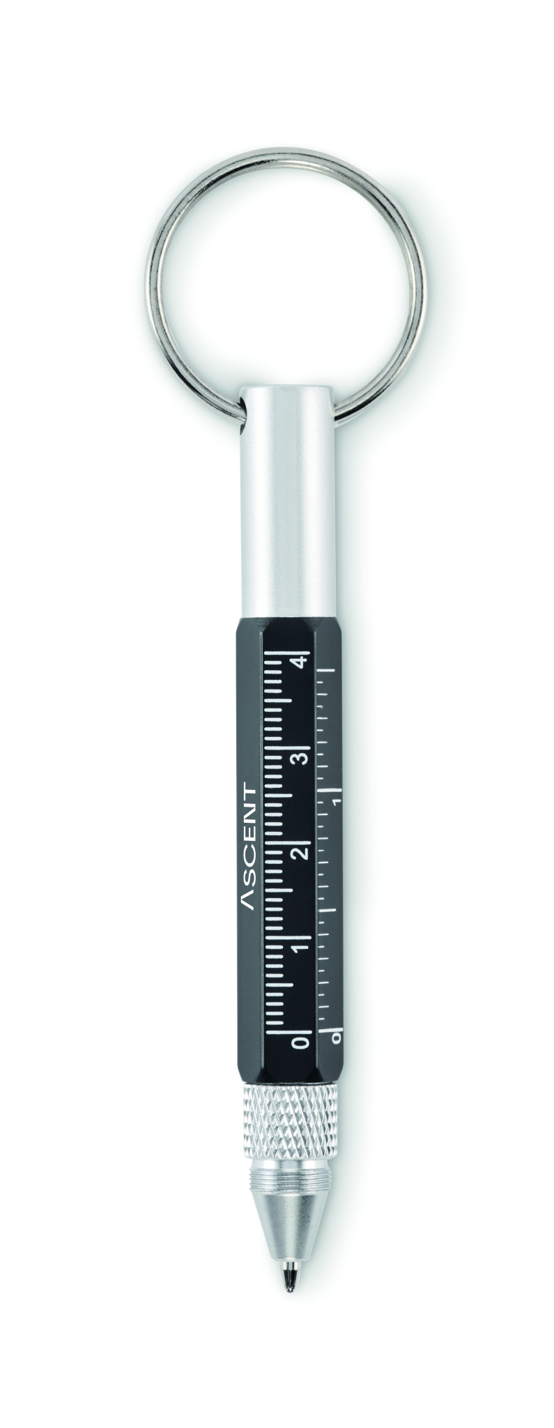 Taaskasutatud alumiiniumist võtmehoidja erinevate funktsioonidega, 4 cm/1,5-tolline joonlaud, pastapliiats ja 2-ühes ristpeaga ning lameda peaga kruvikeerajaga. Must tint.