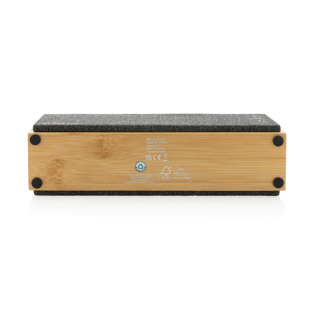 Luksuslik 10 W kõlar selge heli ja tugeva bassiga. Väliskest on valmistatud FSC 100% sertifitseeritud bambusest. Plastosad on valmistatud RCS (Recycled Claim Standard) sertifitseeritud ringlussevõetud ABS-ist. Taaskasutatud kogusisaldus: 23% kauba kogukaalust. RCS-sertifikaat tagab taaskasutatud materjalide täielikult sertifitseeritud tarneahela. Kõlariga on kaasas BT 5.1, mis tagab lihtsa ja sujuva töö kuni 10 meetri kaugusel ning väikese energiatarbimise. 1200 mah aku võimaldab mängida kuni 6 tundi ja seda saab täielikult laadida 2 tunniga. Vastuvõtufunktsiooni ja mikrofoniga (video)kõnedele vastamiseks. Pakitud, kui FSC mix kraft kasti. Kaasa arvatud RCS-sertifikaadiga taaskasutatud TPE laadimiskaabel.