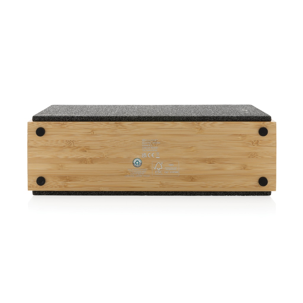 Luksuslik ja võimas 20 W kõlar selge heli ja tugeva bassiga. Väliskest on valmistatud FSC 100% sertifitseeritud bambusest. Plastosad on valmistatud RCS (Recycled Claim Standard) sertifitseeritud ringlussevõetud ABS-ist. Kogu taaskasutatud sisaldus: 17% toote kogukaalust. RCS-sertifikaat tagab taaskasutatud materjalide täielikult sertifitseeritud tarneahela. Kõlariga on kaasas BT 5.1, mis tagab lihtsa ja sujuva töö kuni 10 meetri kaugusel ning väikese energiatarbimise. 1200 mah aku võimaldab mängida kuni 6 tundi ja seda saab täielikult laadida 3 tunniga. Vastuvõtufunktsiooni ja mikrofoniga (video)kõnedele vastamiseks. Pakitud FSC mix kraft karpi. Kaasa arvatud RCS-sertifikaadiga taaskasutatud TPE laadimiskaabel.