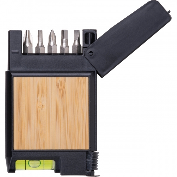 3 metrin mittanauha, valmistettu muovista, jossa on vatupassi, lukituspainike ja viisi erilaista mittakärkeä. Logosi on painettu bambu-upotusmateriaaliin.