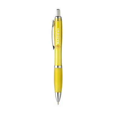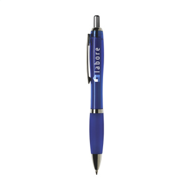 Sinisellä tai mustalla musteella kuulakärkikynällä on läpinäkyvä värillinen piippu, liukumaton kahva ja metallipidike.