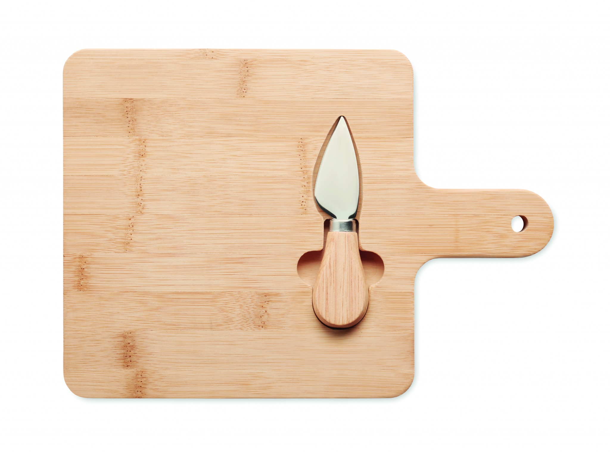 Bambusta valmistettu juustolauta tarjoiluveitsellä. Luonnollisen materiaalin (bambu) vuoksi, tuotteiden värissä/ koossa saattaa olla erinäisyyksiä ja tämä voi vaikuttaa painatuksen lopputulokseen.