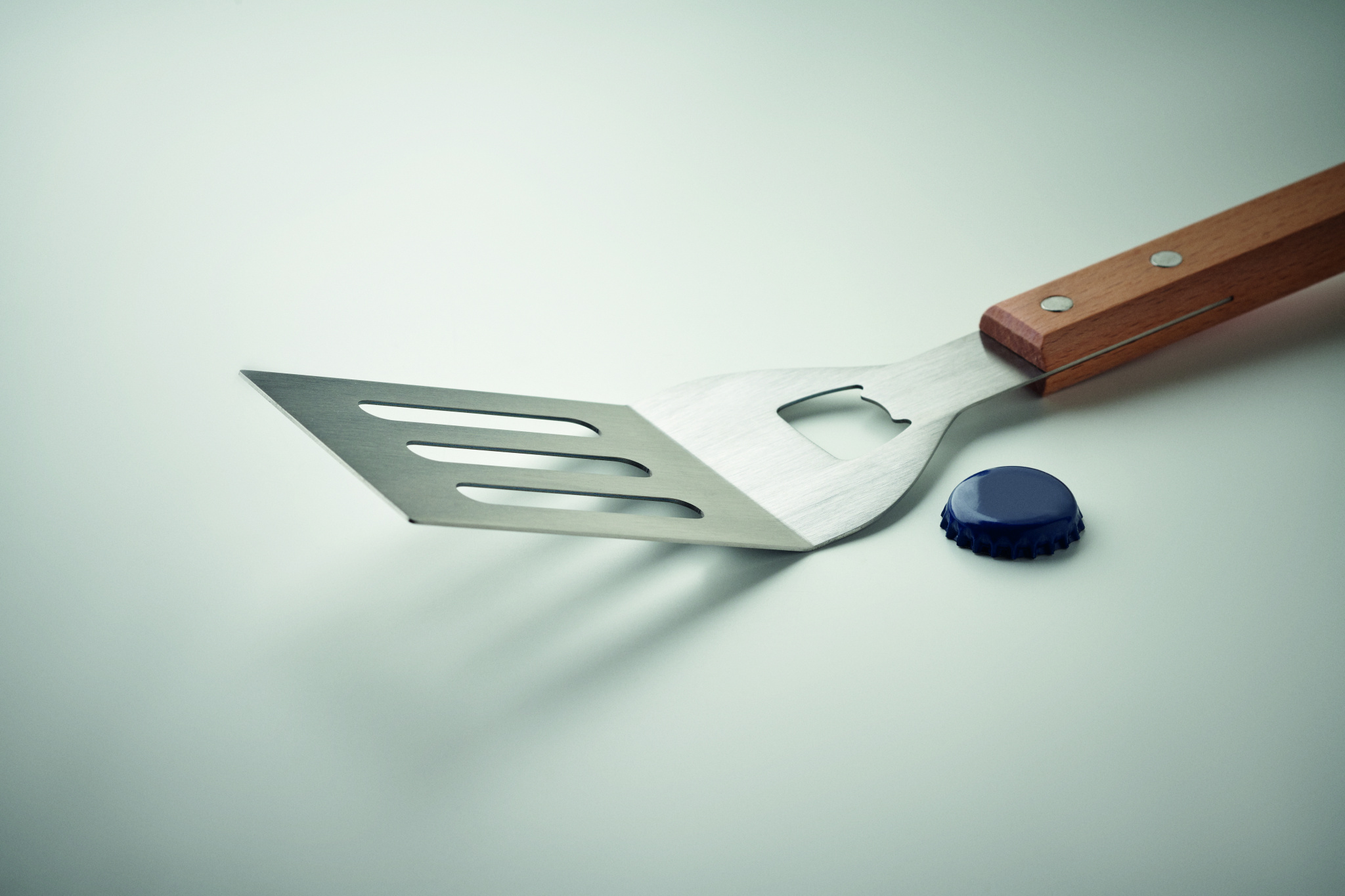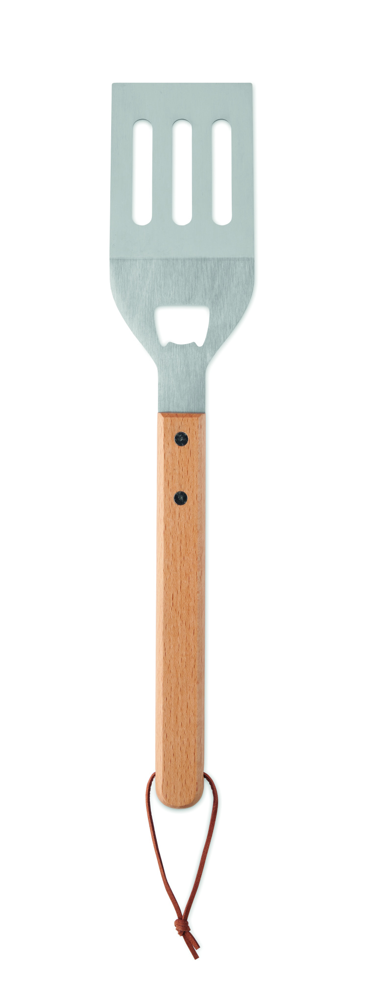 Ruostumattomasta teräksestä valmistettu grillilasta, jossa on pyökkipuinen kahva ja integroitu pullonavaaja. Mukana PU-naru helppoa säilytystä varten.