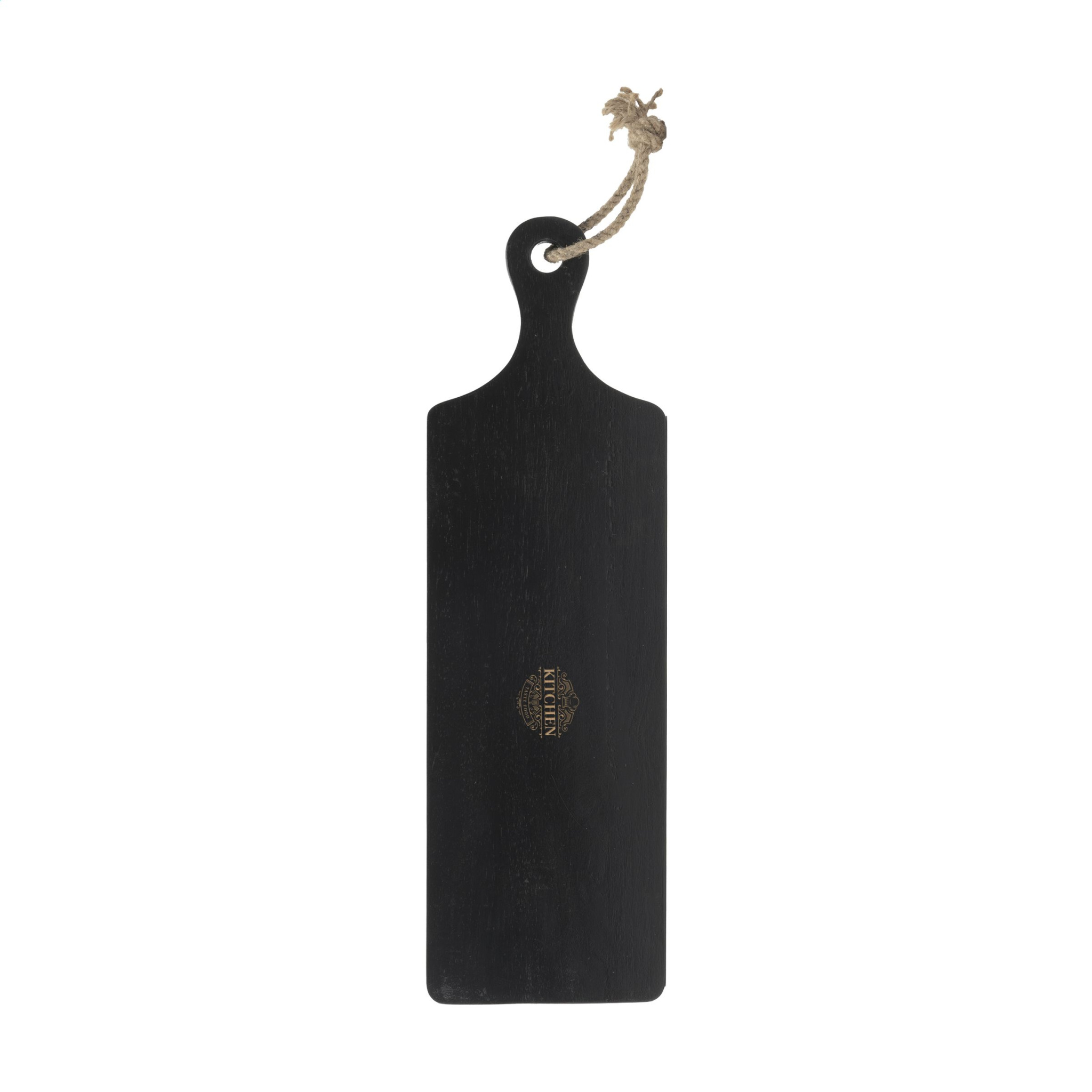 Tarjoilulauta koristenauhalla. Lauta on valmistettu vahvasta kumipuusta ja viimeistelty tyylikkäällä mustalla lakalla. Ihanteellinen tapaslaudaksi, jossa alkupalat kontrastivat kauniisti mustaa taustaa vasten, mutta sopii myös leikkuulaudaksi.