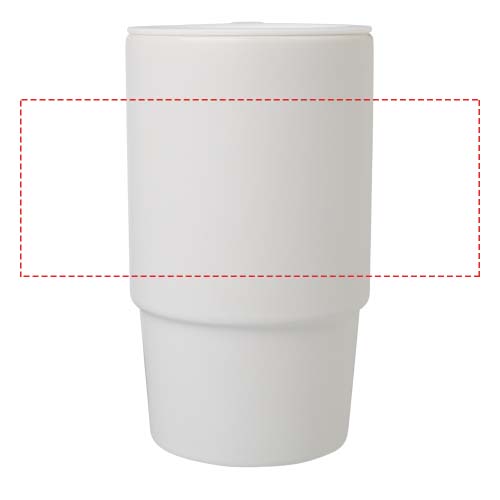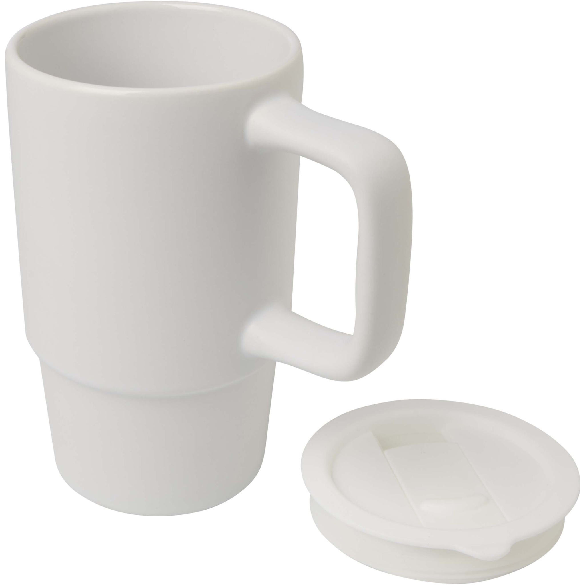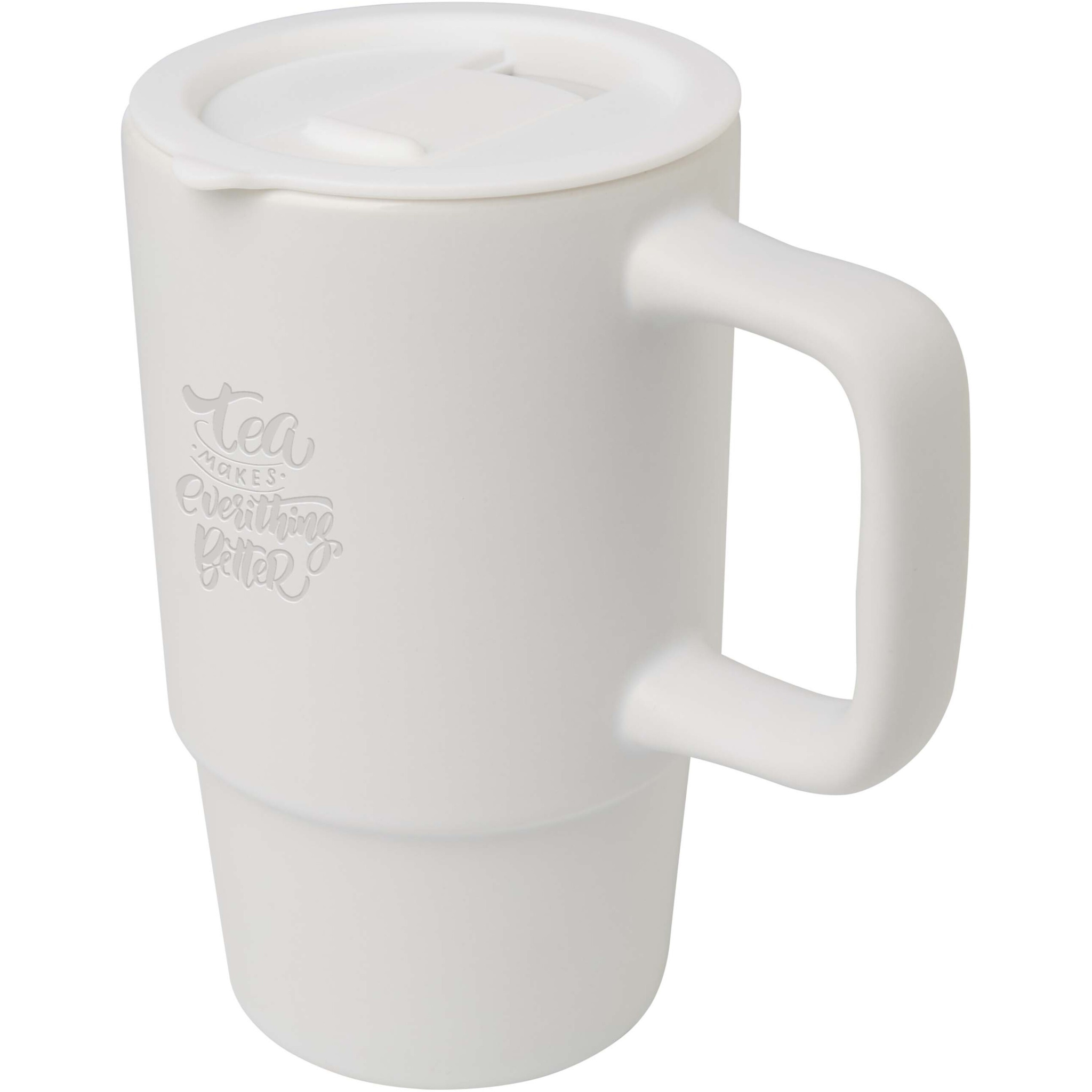 Keraaminen muki, jossa on ylikokoisen suuri kahva helpottamassa kantamista, ja roiskeenkestävä muovikansi mahdollistaa kätevän käytön liikkeellä ollessa. Ulkopinnassa on tyylikäs mattapinta, ja pullo on konepesun kestävä kaikilla painatusmenetelmillä. Toimitetaan kierrätetystä kartongista valmistetussa lahjapakkauksessa. Tilavuus: 450 ml.