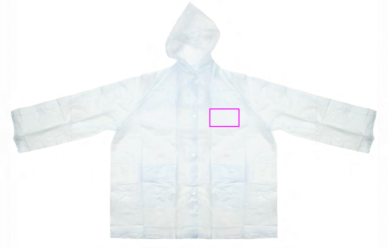 PVC-sadetakki (yksi koko XL) läpinäkyvä himmeä huppu, kaksi etutaskua ja painonapit. Painamme logosi rintaan (sydämen puolelle).
