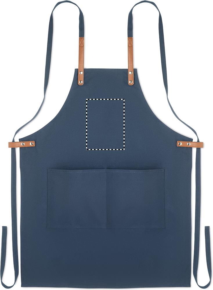 Säädettävä ja 2 etutaskulla varustettu 340 gr/m² orgaanisesta puuvillasta valmistettu esiliina.