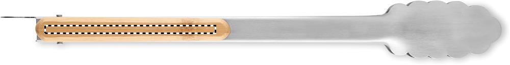 Ruostumattomasta teräksestä valmistetut grillipihdit bambukahvoilla. Lukitusmekanismi.