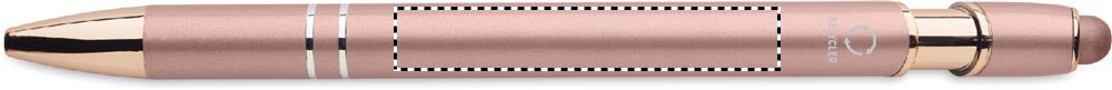 Kierrätysalumiinista valmistettu styllus push ball -kynä ruusukultaisilla yksityiskohdilla. Sininen muste.