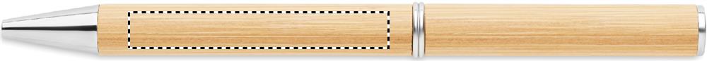 Bambusta valmistettu kuulakärkikynä kiertomekanismilla, jossa on metalliset yksityiskohdat. Sininen muste.