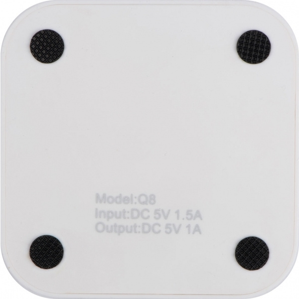 Muovinen langaton laturi 2 USB-portilla, latauskaapeli mukana. Lataa kaikkia QI-yhteensopivia älypuhelimia. Logosi tulostetaan laitteeseen.