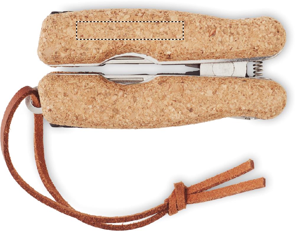 Ruostumattomasta teräksestä valmistettu monikäyttöinen taskuveitsi, jossa on korkkisuojus ja PU-nauha. Sisältää: pihdit, 2 avaajaa, ruuvimeisseli Philipsin terillä, sahanterät, veitsi, viila ja ruuvimeisseli litteällä terällä.
