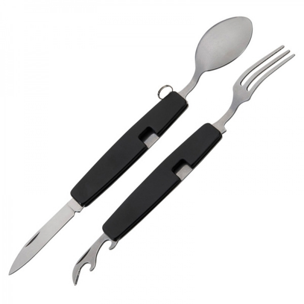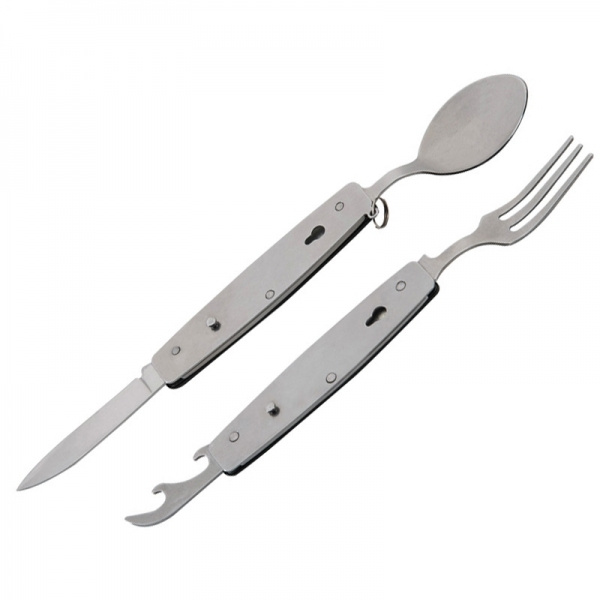 Ruostumattomasta teräksestä valmistetut kaksiosaiset retkeilyaterimet. Se voidaan halkaista keskeltä niin, että saat veitsen ja haarukan tai pullonavaajan ja lusikan. Kaiverrustamme logosi toiselle puolelle.