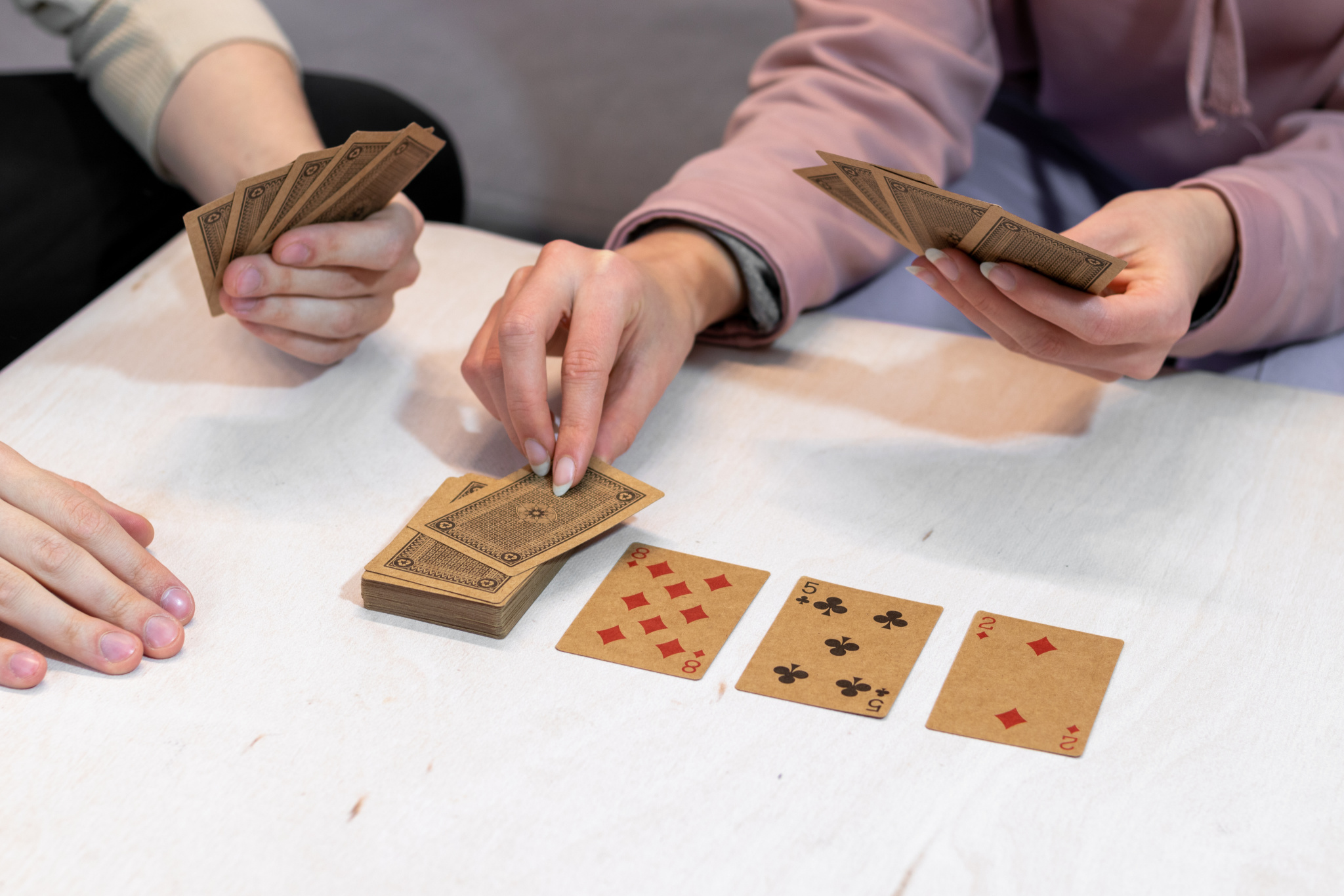 Kestävään pelaamiseen. Klassinen korttipeli, jossa ranskalainen lehti (Skat) on valmistettu kierrätyspaperista kierrätetyssä pahvilaatikossa. Logosi asetetaan laatikkoon.