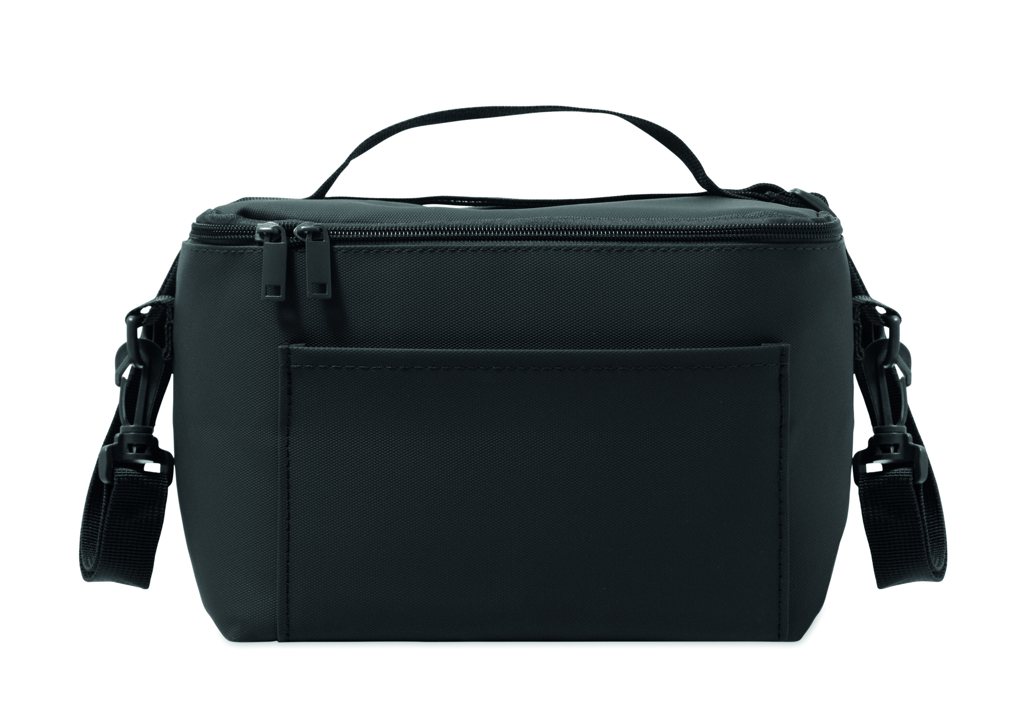 Kylmälaukku PU-muovista, jossa 100 g RPET-polyesterivuori. Yksi etutasku, kahva ja olkahihna. Eristävää PE-vaahtoa ja PEVA-vuori. Tilavuus 5,5 l.