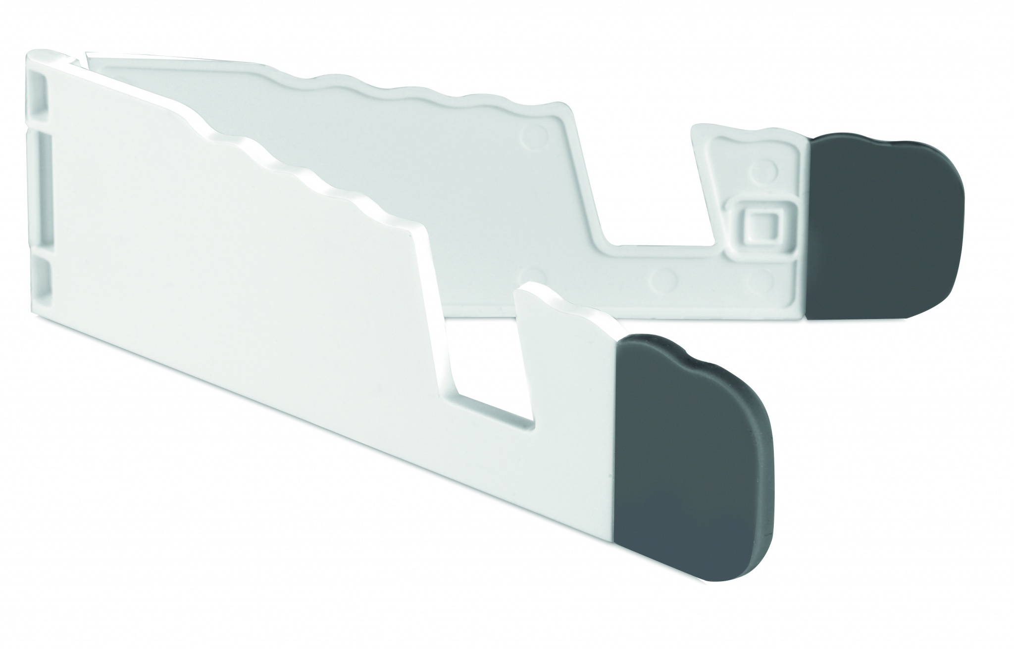 ABS- muovinen puhelimen taikka tablettimen pidike, harmaat silikoniset päät.