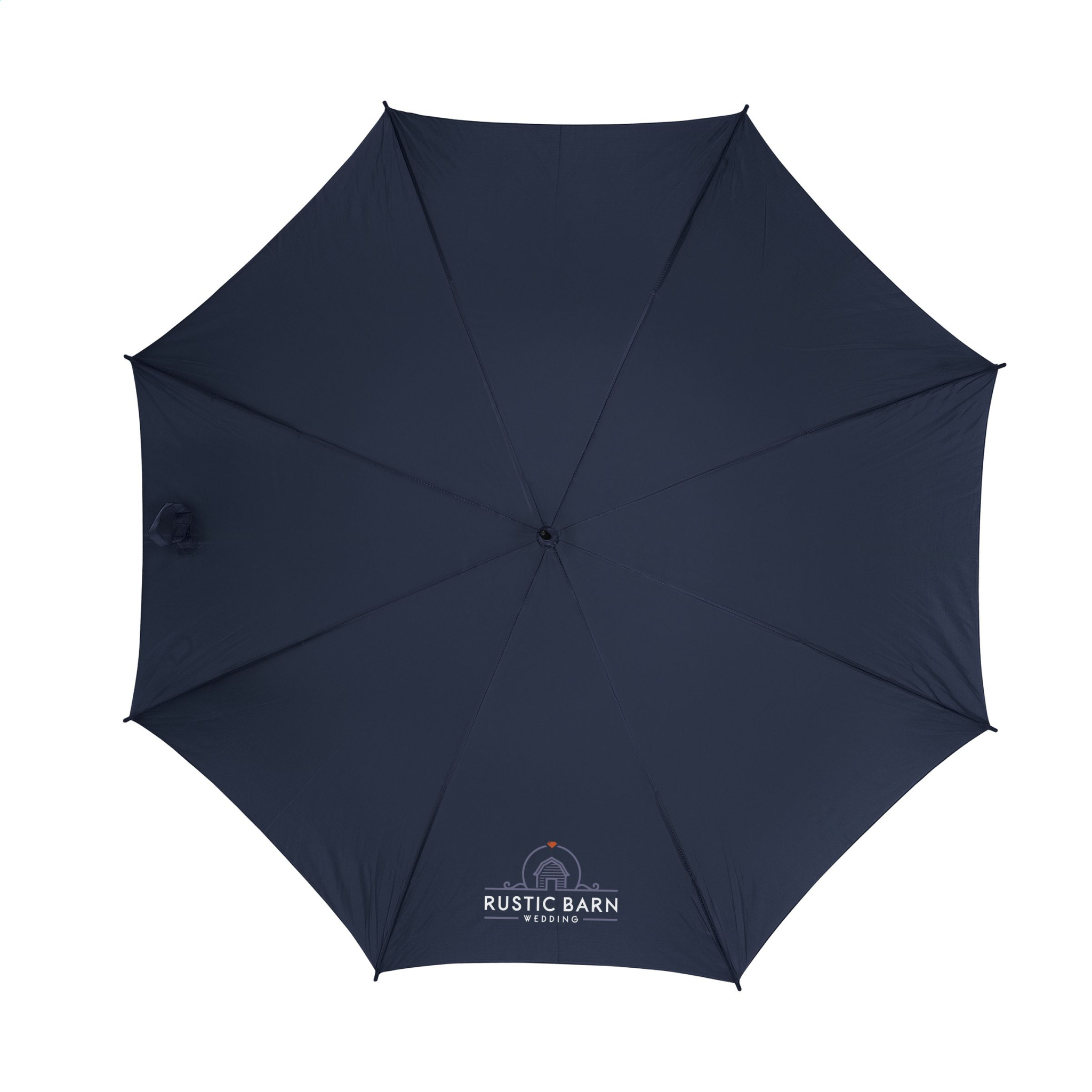 Sateenvarjo, jossa automaattinen teleskooppiaukko, 190T polyesterikatos, metallirunko ja -varsi, puinen kahva ja tarrakiinnitys.