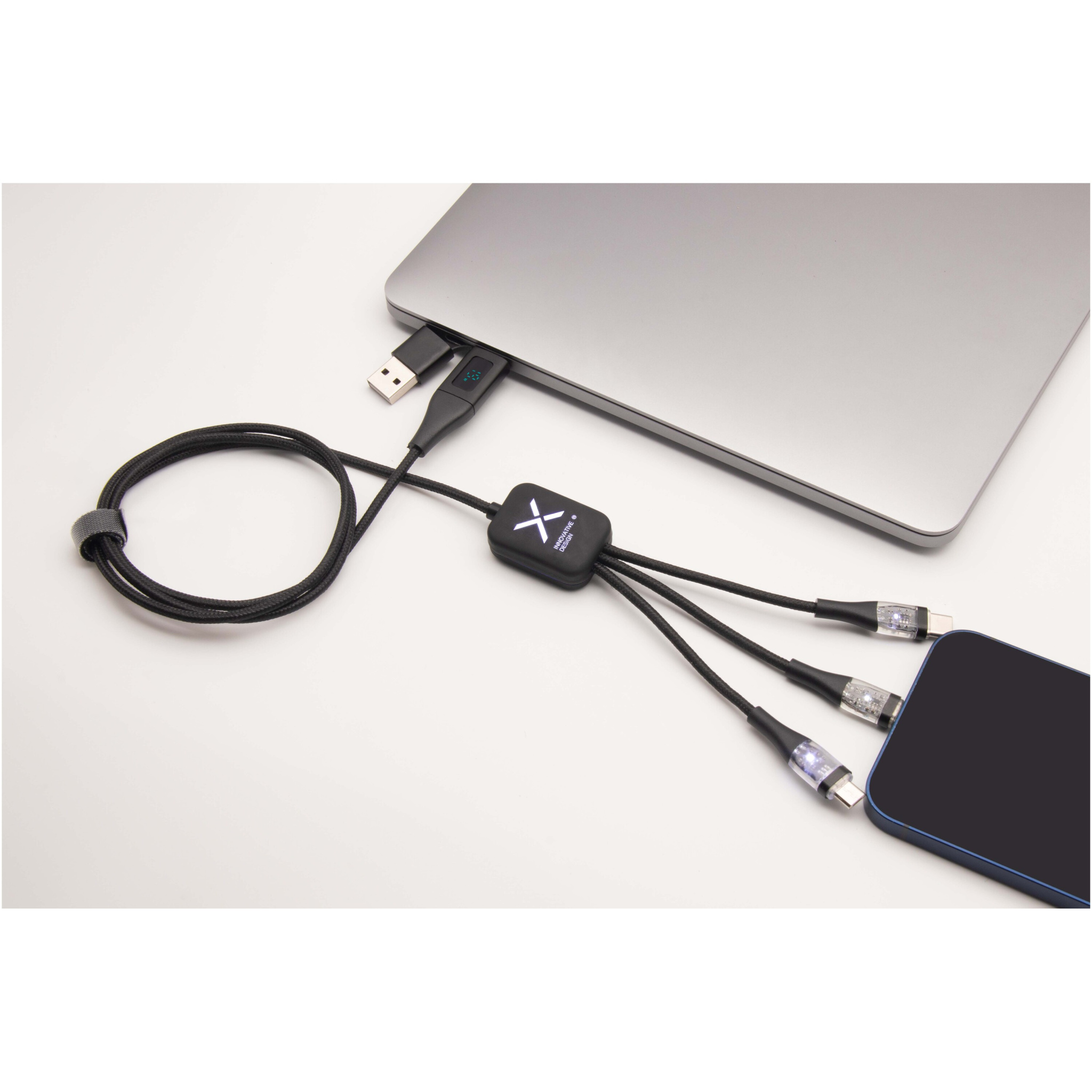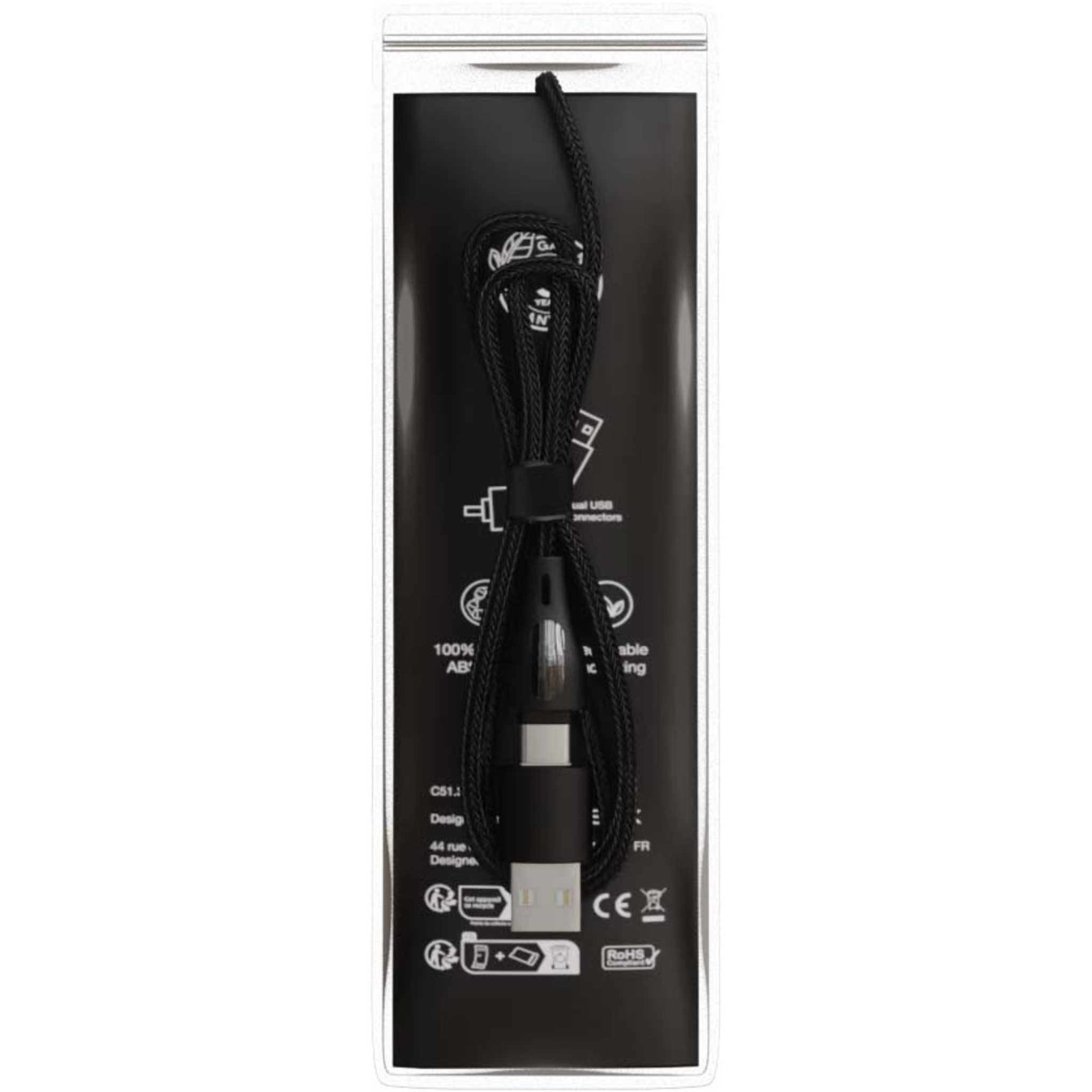 60 W:n kierrätetystä PET-muovista valmistettu 5-in-1-pikalatauskaapeli, jossa on valaistu kaksipuolinen logo ja kolme liitintä (Type-C, iPhone ja Android). Kaapelissa on sekä USB-A- että USB-C-liitin, minkä ansiosta se on täysin yhteensopiva uusimpien tietokonemallien kanssa. Kaapelilla voi ladata useita laitteita samanaikaisesti. Mukana toimitetaan kierrätettäväTPU-pussi sekä kierrätyspaperista valmistettu etiketti. Johdon pituus: 1 metri.