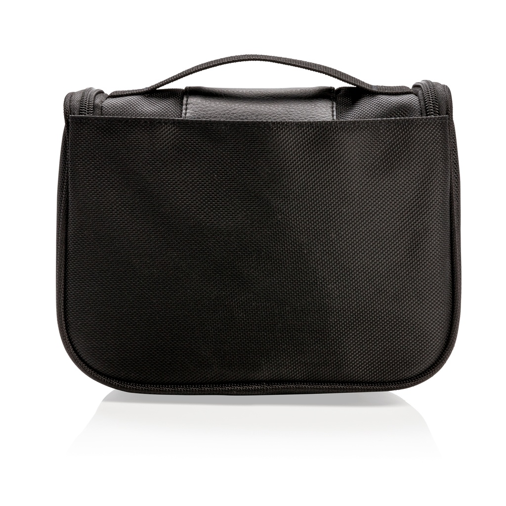 1680D:n polyesteristä valmistettu toilettipussi, jonka sisällä yksi pääosasto ja 4 osastoa + 2 avointa verkkotaskua ja 1 vetoketjulla suljettava verkkotasku. Sisältää koukun toilettipussin kätevää ripustamista varten.