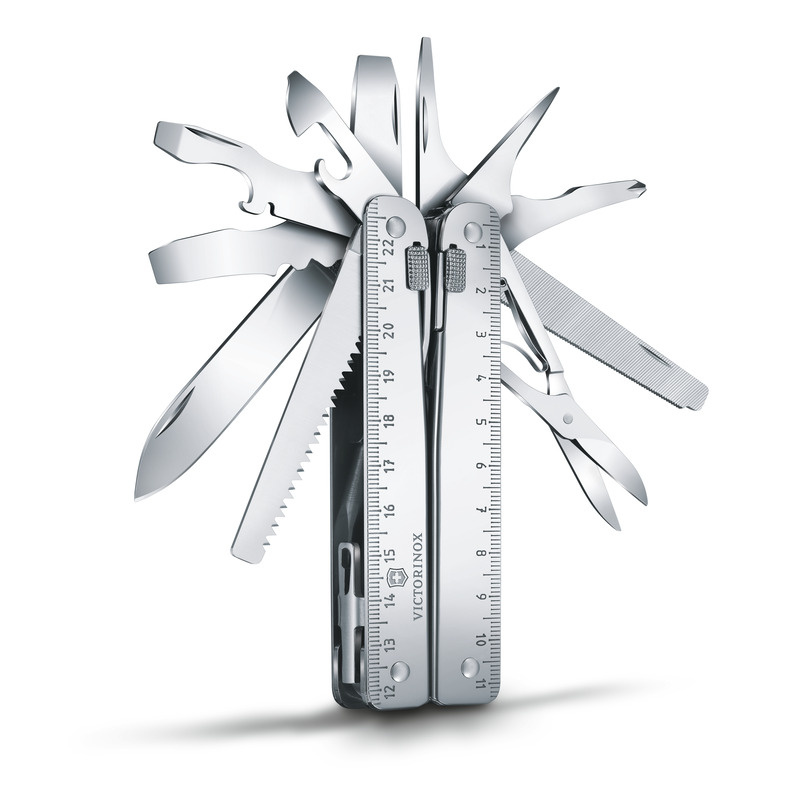 Swiss Tool X on tarjous niille, jotka etsivät jotain enemmän kuin taskuveitsi. Se on koko joukko työkaluja yhteen tyylikkääseen koteloon, jossa on hyvin harkittu muotoilu. Työkalun mukana tulee nahkakotelo. Ominaisuudet: 1. neulakärkiset pihdit 2. langanleikkuri ohuelle ja pehmeälle langalle 40 HRC asti 3. kova lankaleikkuri 4. iso terä 5. sakset 6. puusaha 7. kalvin, rei'itys 8. tölkinavaaja 9. ruuvimeisseli 3 mm 10. pullonavaaja 11. ruuvimeisseli 5,5 mm 12. taivutuslanka 13. ristipääruuvimeisseli 1/2 14. ruuvimeisseli 2 mm 15. ruuvimeisseli 8 mm 16. vahva laatikonavaaja 17. taltta 7 mm 18 . langanpoistaja 19. lankakaavin 20. viivain (tuumaa) 21. kaulanauhan reikä 22. viivain (cm) 23. metallisaha 24. metalliviila L2 - kaiverrus terässä L3 - kaiverrus kannessa