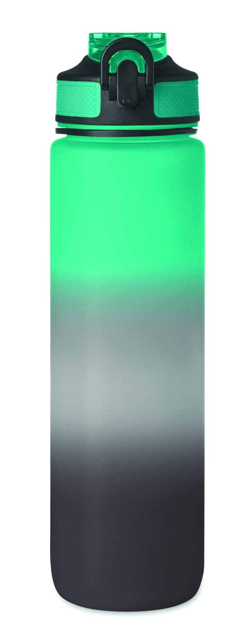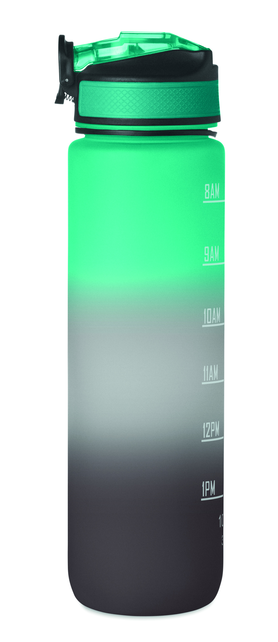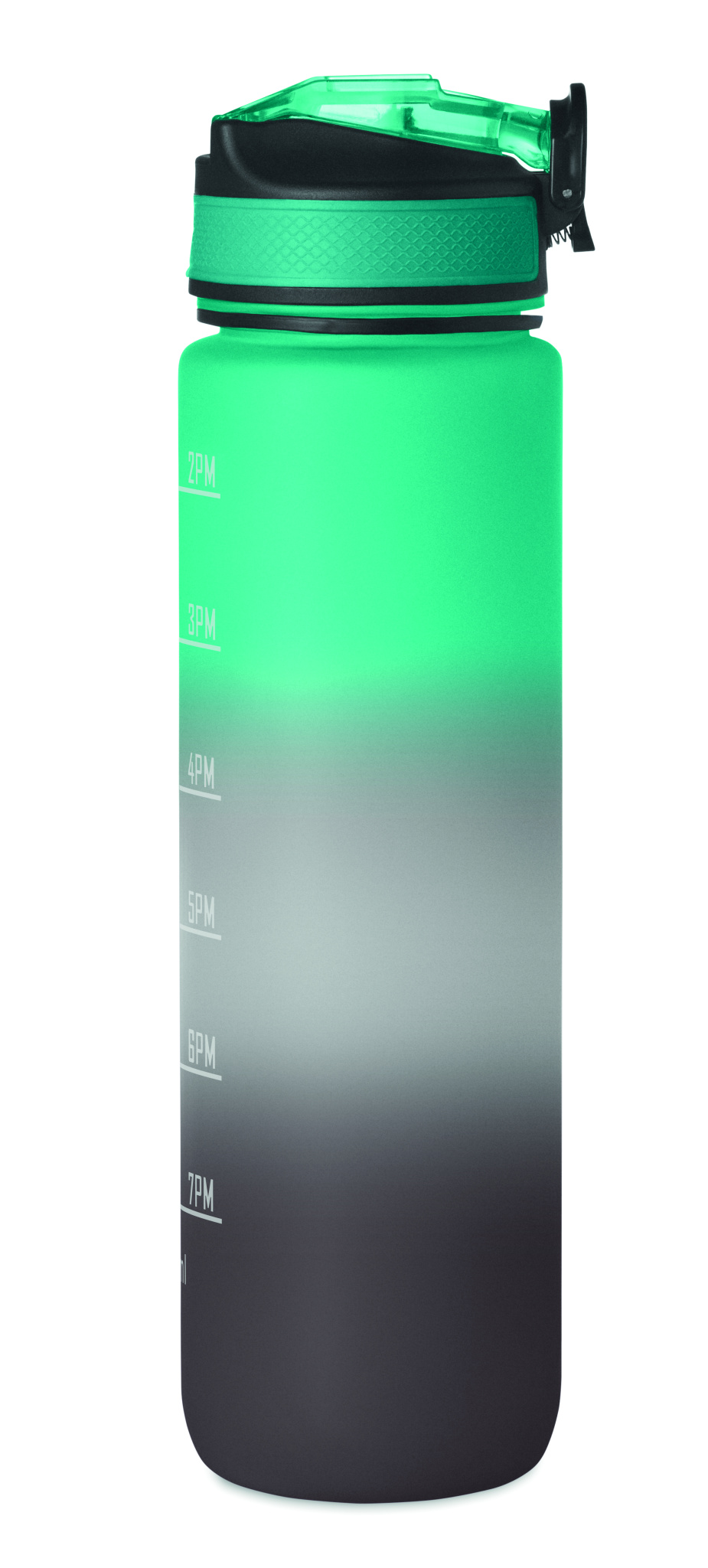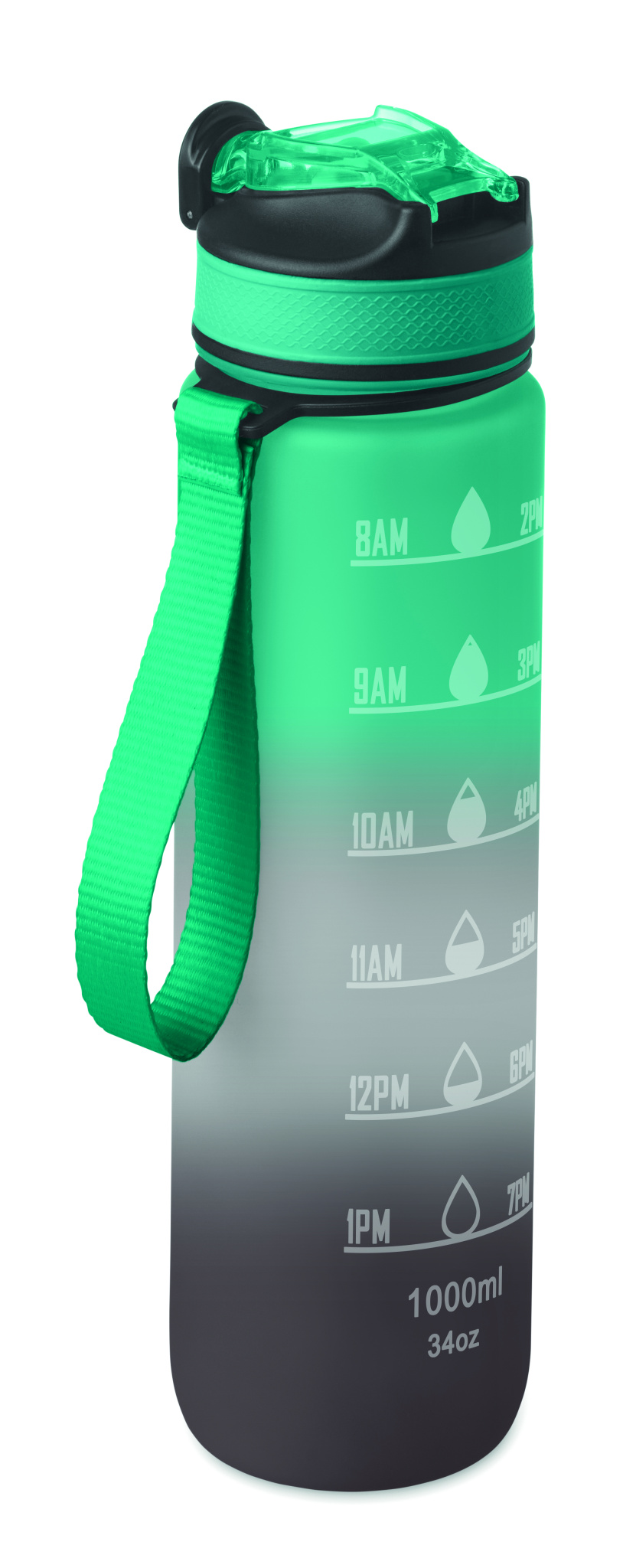 RPET-muovista valmistettu urheiluvesipullo, jossa on integroitu olki, pehmeä silikoninen suukappale, motivoiva aikamerkintä, yhdellä kädellä avattava kääntyvä kansi, turvalukko ja kantohihna. Vuotamaton. Tilavuus 1L.
