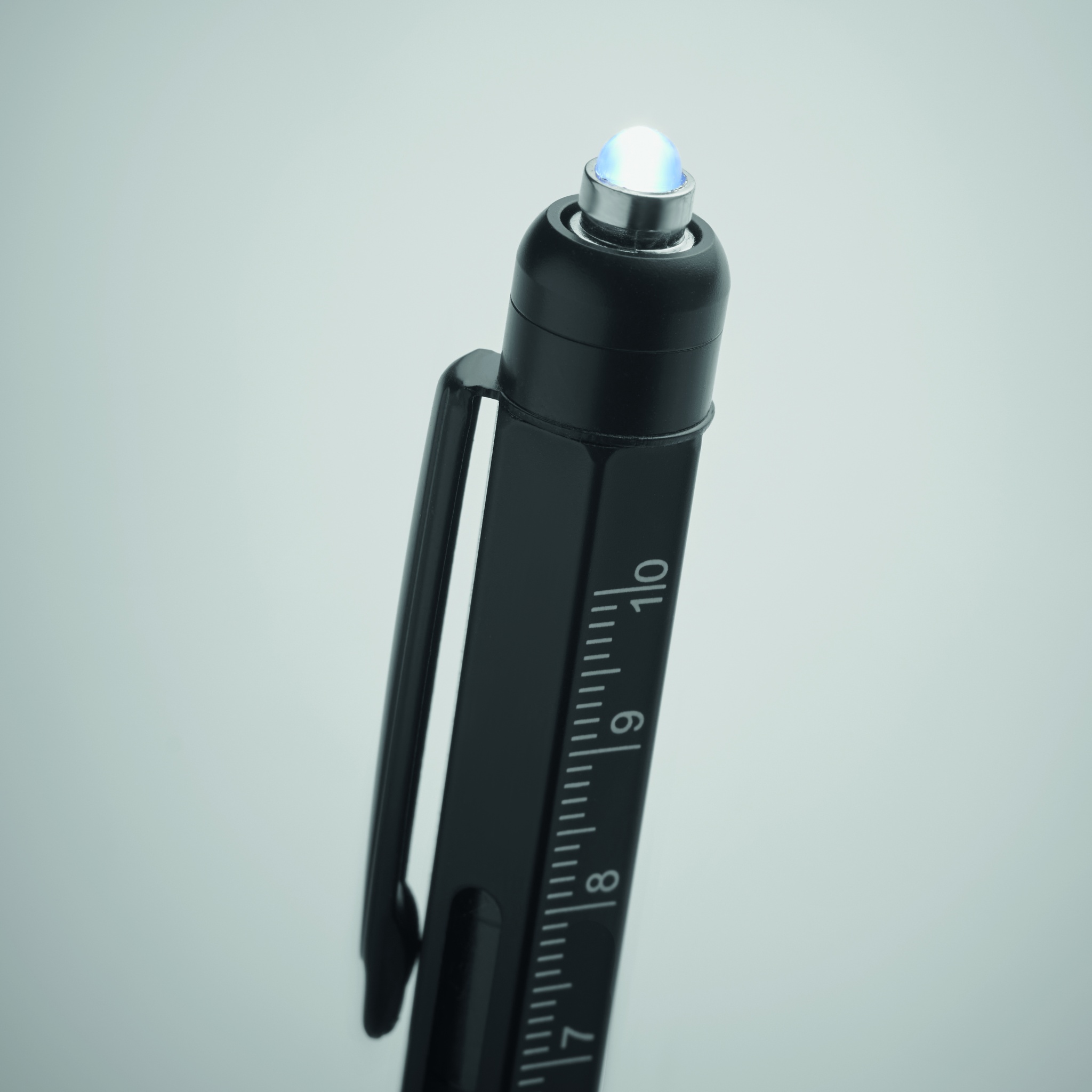 Ruostumattomasta teräksestä valmistettu kierrettävä vesivaakakynä, jossa on viivoitin, kynän ja Phillips- ja litteäpäiset ruuvimeisselit sekä LED. Mukana 3 AG-paristoa. Sininen muste.