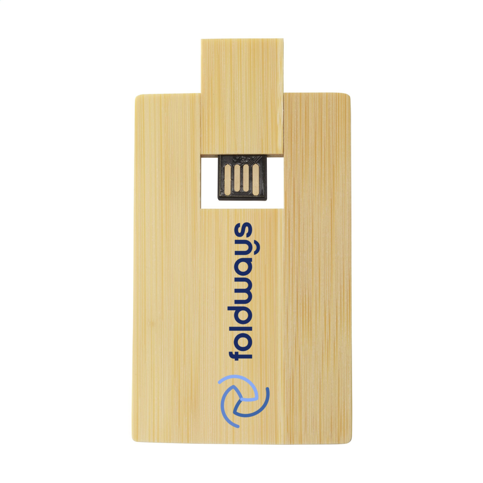 ECO bambukinė USB atmintinė (2.0 versija), skirta saugiam ir patogiam failų saugojimui ir transportavimui. Kadangi jis yra kreditinės kortelės formos, jis yra pakankamai plonas, kad jį būtų galima laikyti piniginėje. Dėl praktiškos „Plug & Play“ sistemos paruoštas naudoti nedelsiant. Suderinamas su Windows, Mac ir Linux. Kiekviena prekė tiekiama atskiroje rudos spalvos kartoninėje dėžutėje. Į kainą įskaičiuotas vienos spalvos įspaudas vienoje gaminio pusėje.