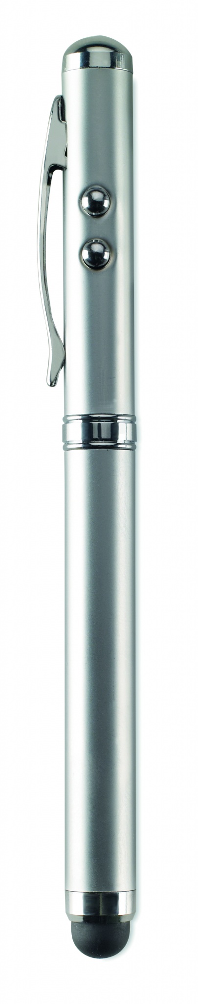 Metalinis lazerinis rodyklė. Balta LED lemputė, raudonas lazerinis žymeklis ir švelnus jutiklinis antgalis. Yra 3 mygtukų elementų baterijos. Pristatoma metalinėje skardinėje dėžutėje.
