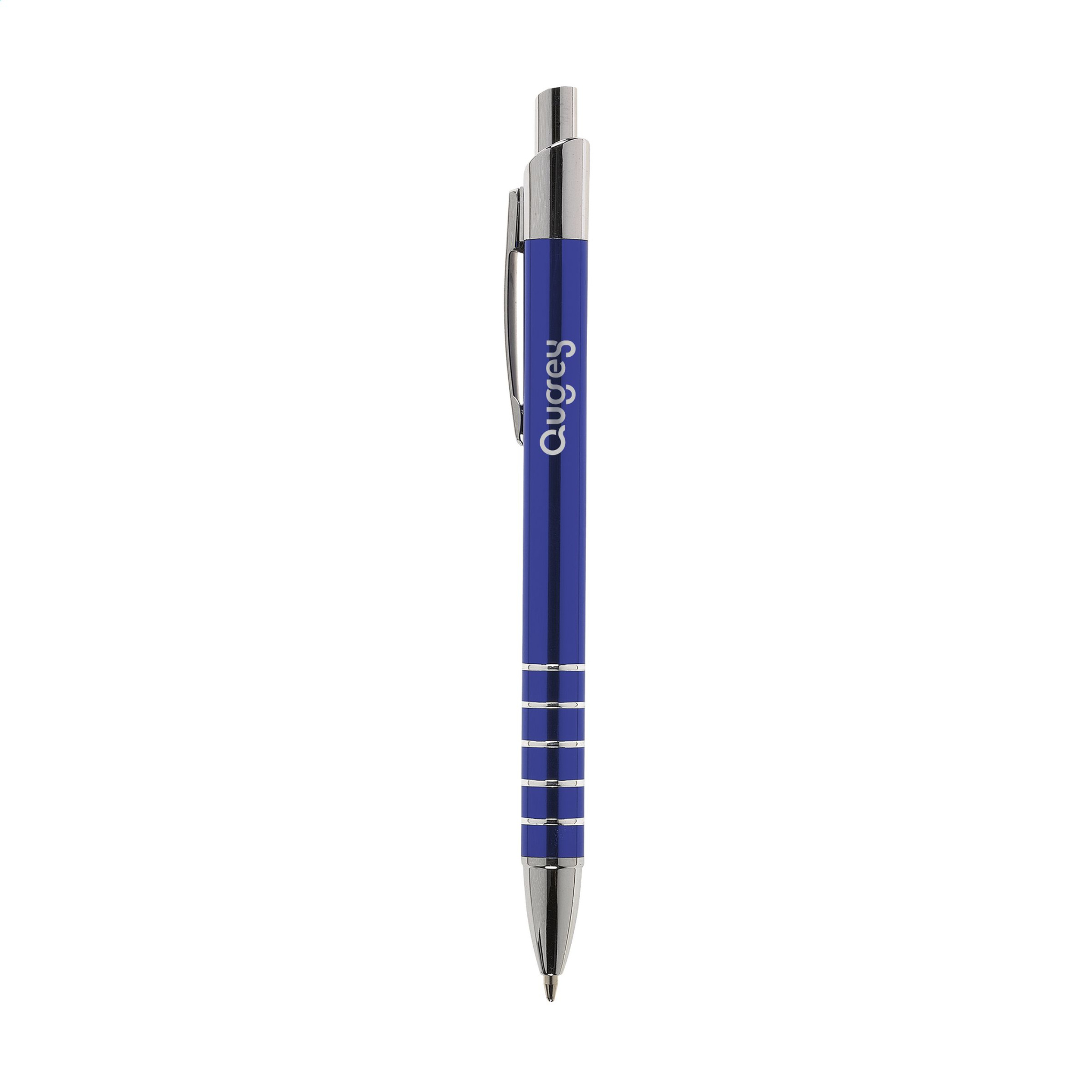 Mėlynas rašalas, metalinės išvaizdos aliuminio tušinukas su metaliniu segtuku ir apdaila.