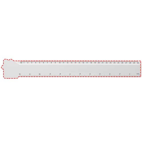 Namo formos vientisa perdirbto plastiko liniuotė su ženklais coliais arba centimetrais.