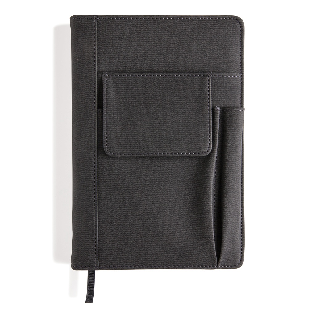 Dengtas PU nešiojamojo kompiuterio dangtelis su priekine telefono kišene (14 x 10 cm), kišene rašikliui ir viena pagrindine kišene. Juodas lapų daliklis ir 160 puslapių 80g/m2 popieriaus viduje. Šį bloknoto dangtelį galima pakartotinai naudoti su nauju A5 formato užrašų knygelės popieriumi, kad galėtumėte rašyti be galo.