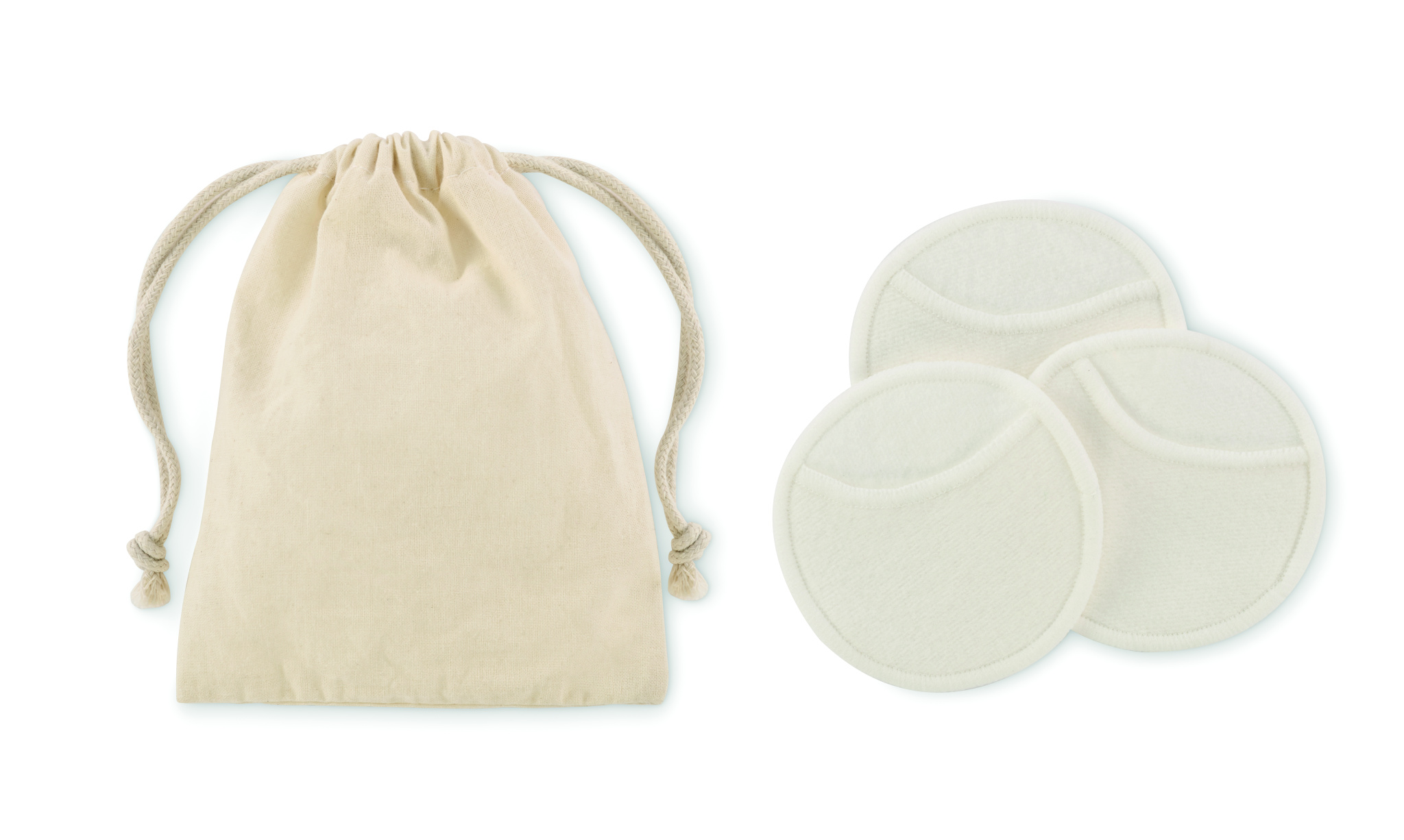 Kokvilnas maisiņā 3 gabali atkārtoti lietojami un mazgājami mīksti sejas tīrīšanas spilventiņi (diametrs 8 cm), kas izgatavoti no 70% bambusa šķiedras un 30% kokvilnas.
