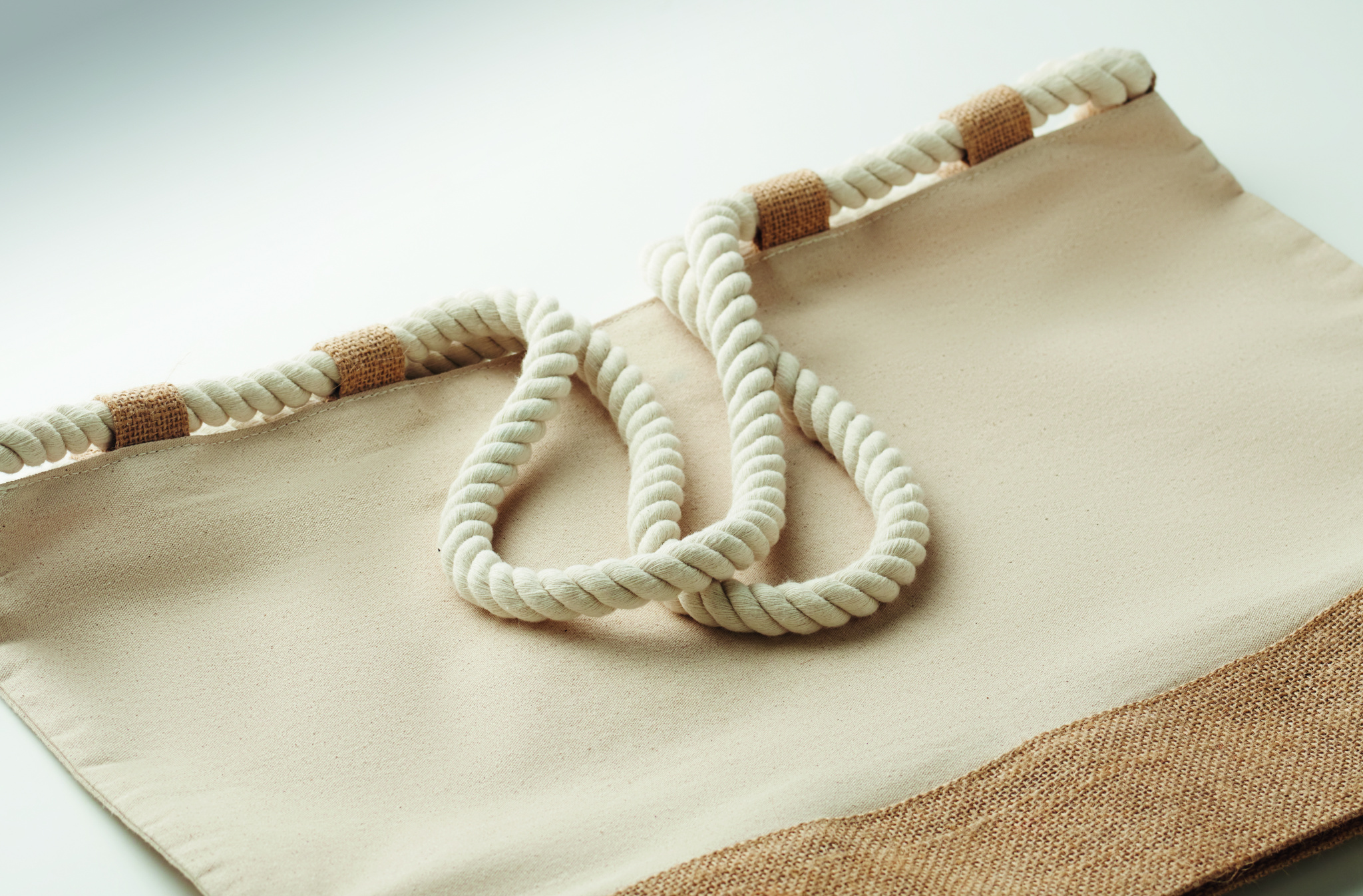 Pludmales soma no 280 g/m² kokvilnas audekla un džutas ar auklas rokturiem. Ar rāvējslēdzēja aizdari, ar džutu pārklātu apakšējo daļu un 10 džutas cilpām.