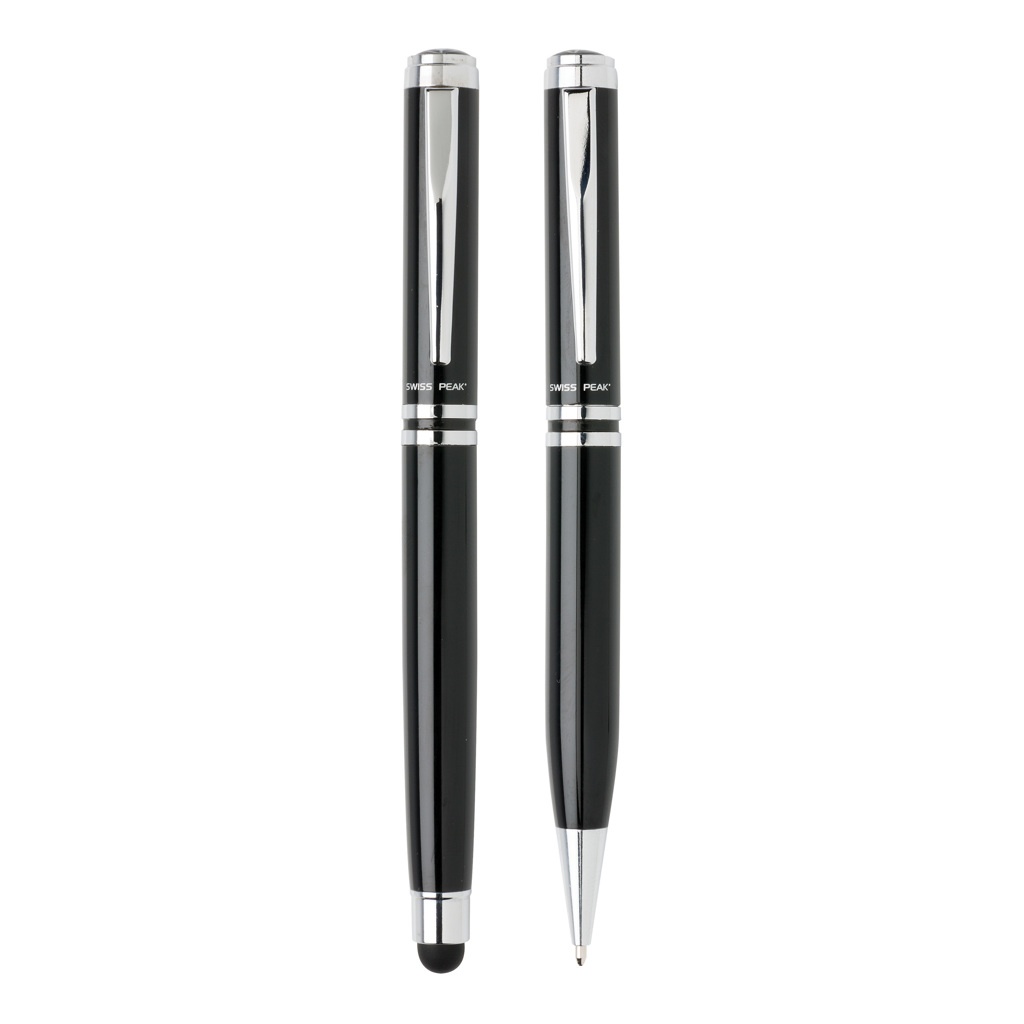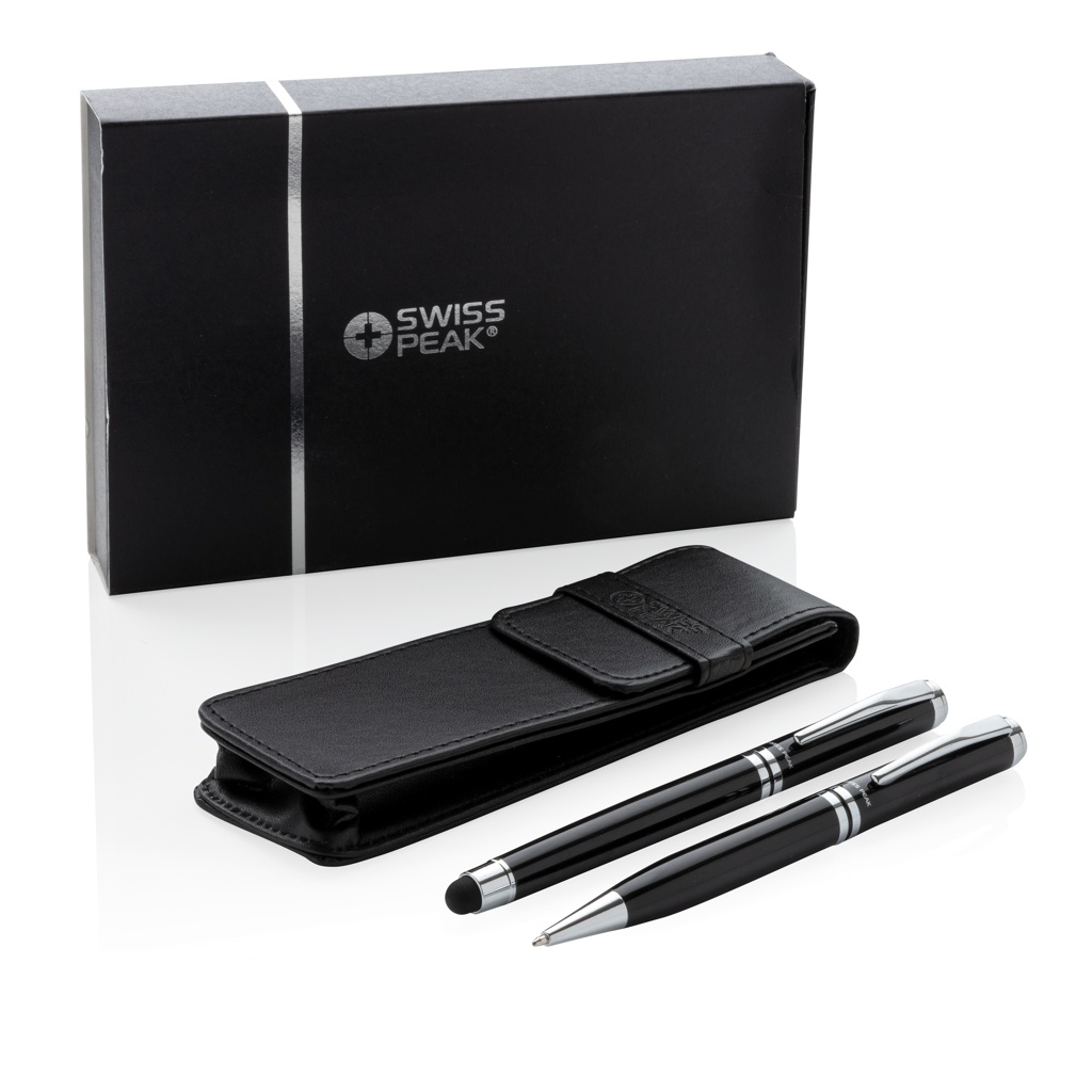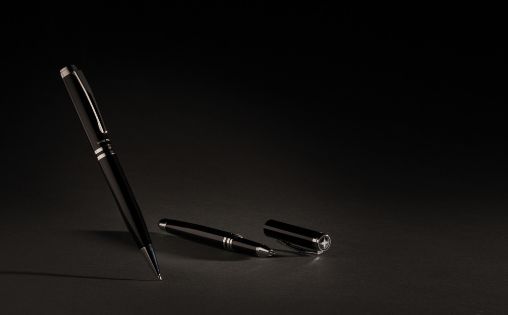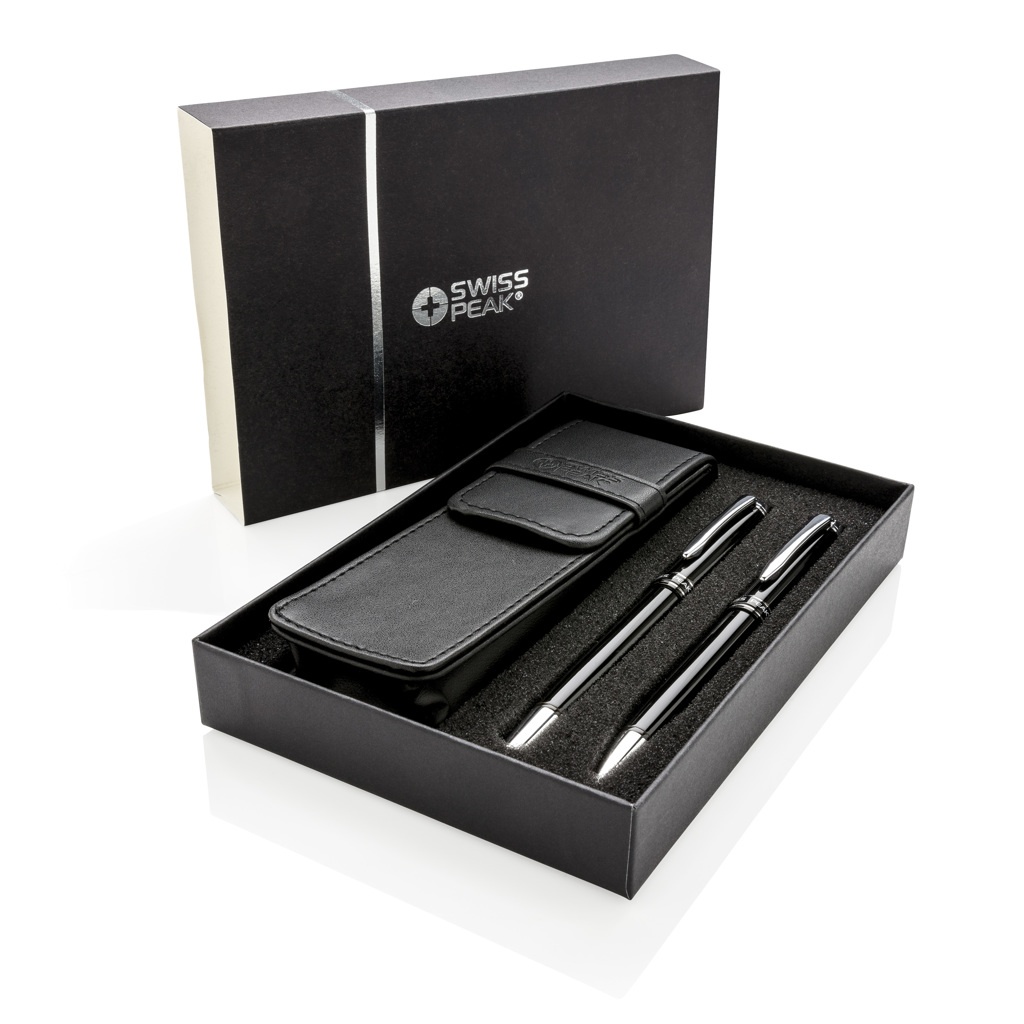 Autentisks pildspalvu komplekts, kam ir visas klasiskās kvalitātes pazīmes. Augstas kvalitātes smagā misiņa metāla rullīšu bumba ar irbuli un lodīšu pildspalvu ar Swiss Peak zīmolu. Ietver augstākās kvalitātes PU ādas maisiņu un dāvanu kastīti. Zilā tinte.