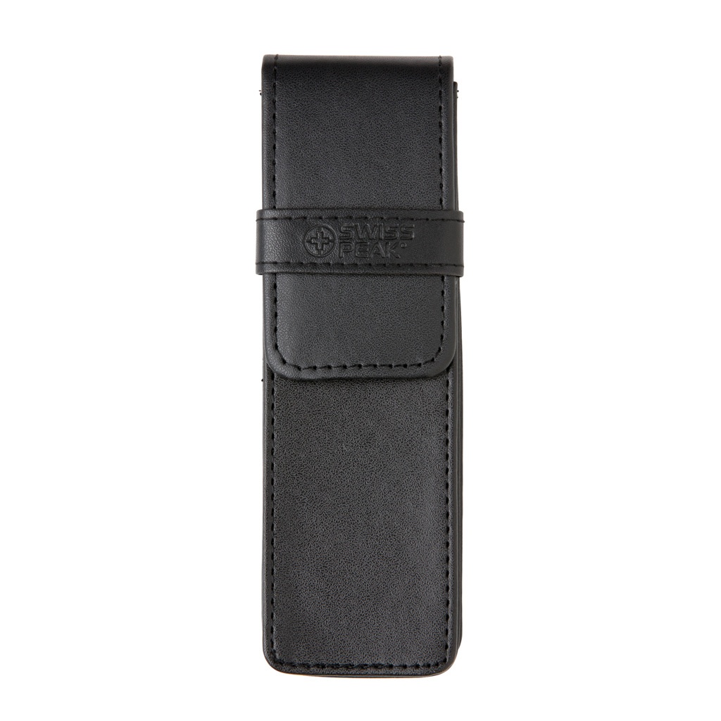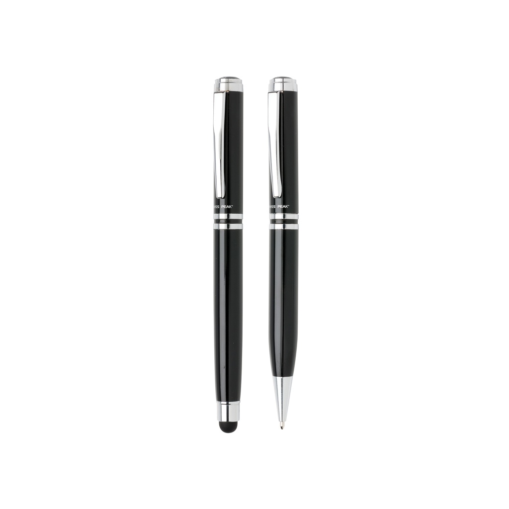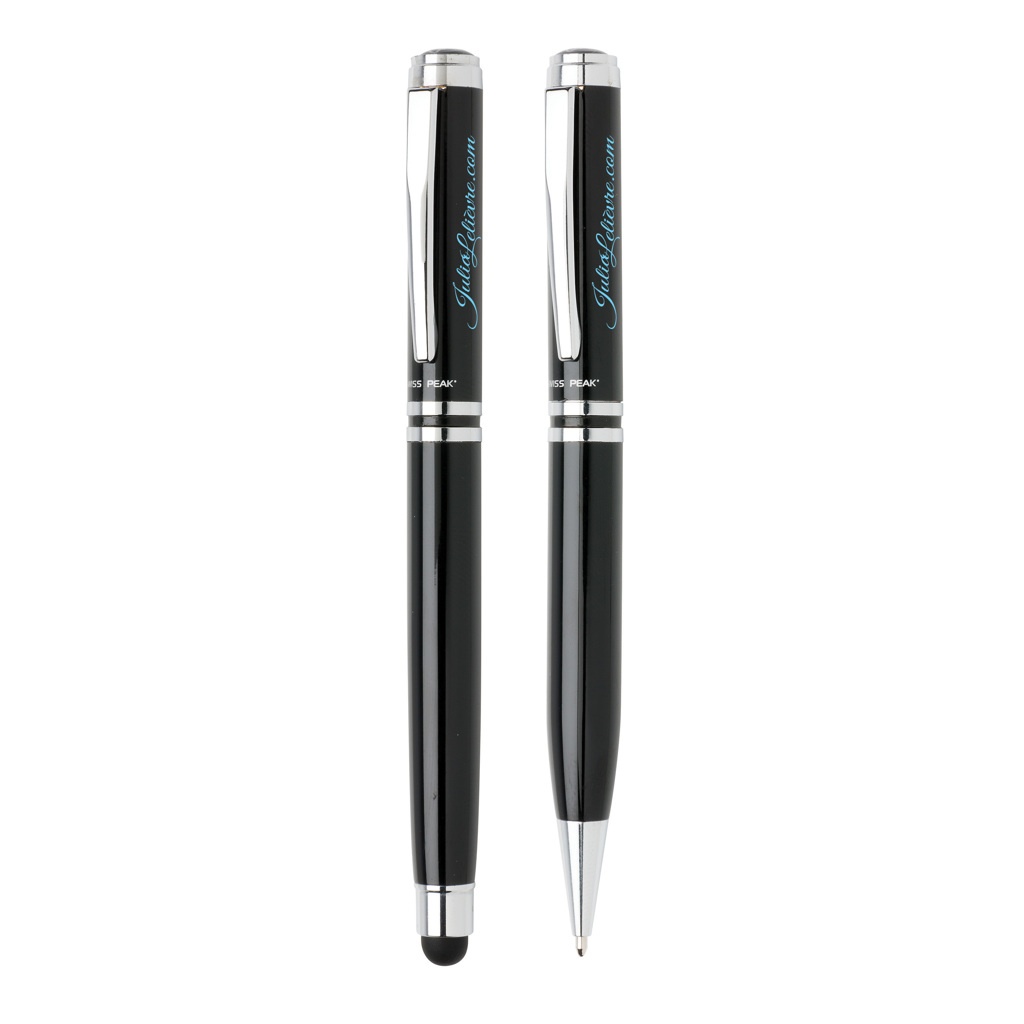 Autentisks pildspalvu komplekts, kam ir visas klasiskās kvalitātes pazīmes. Augstas kvalitātes smagā misiņa metāla rullīšu bumba ar irbuli un lodīšu pildspalvu ar Swiss Peak zīmolu. Ietver augstākās kvalitātes PU ādas maisiņu un dāvanu kastīti. Zilā tinte.