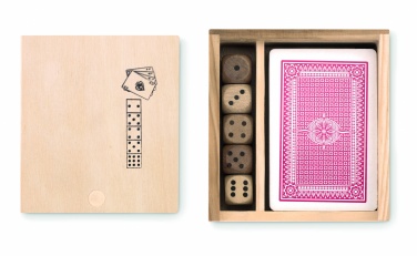Spēļu komplekts ar 54 kārtīm un 5 kauliņiem. Prezentēts koka kastē.