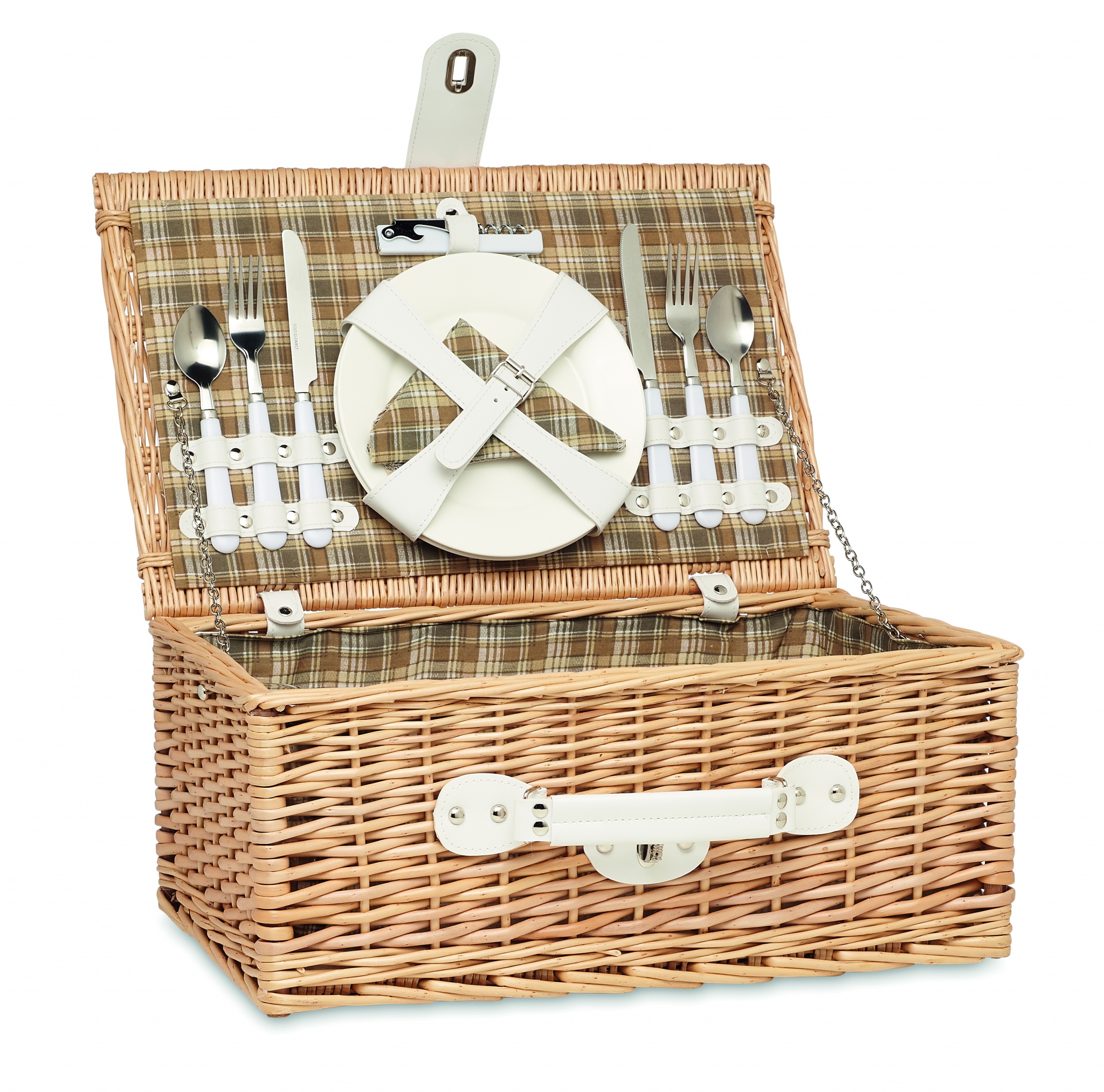 Pīts piknika grozu komplekts 2 personām ar 1 pudeļu attaisāmo, 2 nerūsējošā tērauda karotēm, dakšiņām un nažiem, 2 keramikas šķīvjiem, 2 glāzēm un 2 polikokvilnas salvetēm.
