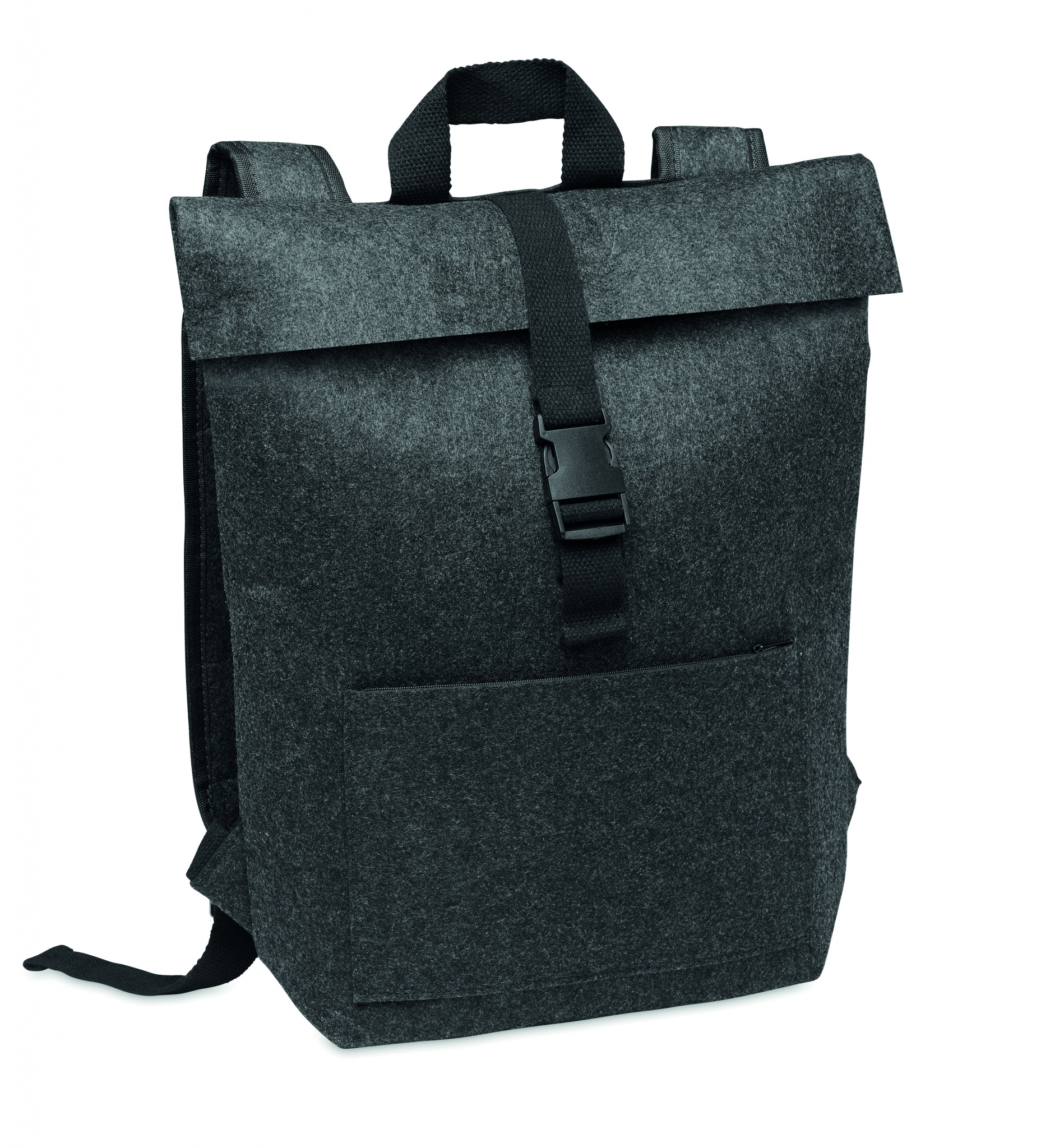 RPET filca mugursoma ar kokvilnas siksnas aizdari un rāvējslēdzēja kabatu priekšpusē. Tam ir klēpjdatora nodalījums.
