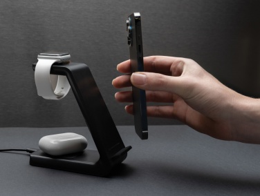 15 W 3 in1 bezvadu uzlādes statīvs, kas izgatavots no RCS (Recycled Claim Standard) sertificēta pārstrādāta ABS. Kopējais pārstrādātais saturs: 60% no kopējā preces svara. RCS sertifikācija nodrošina pilnībā sertificētu pārstrādāto materiālu piegādes ķēdi. Šis bezvadu lādētājs uzlādē tālruni pēc iespējas ātrāk. Lādētājs ir aprīkots ar divu spoļu 15 W bezvadu lādētāju, 5 W bezvadu lādētāju aizmugurē un 3 W iWatch lādētāju. Ietver 120 cm C tipa uzlādes kabeli, kas izgatavots no RCS sertificēta otrreizēji pārstrādāta TPE. Urban Vitamin preces ir izgatavotas bez PVC un iepakotas samazinātā plastmasas iepakojumā. Ieeja: 5V/3A, 9V/2A 5V/1A, 9V/1,1A