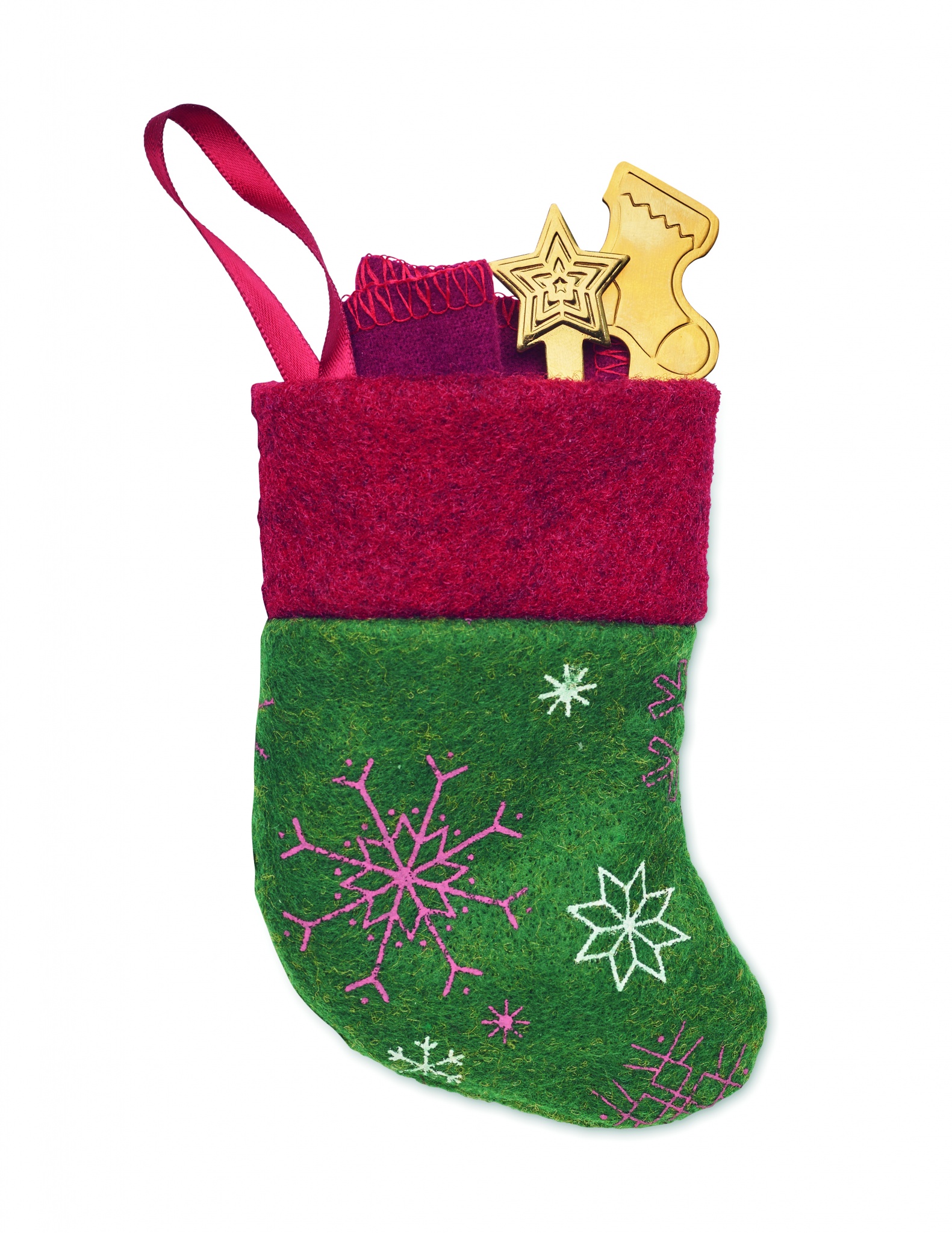 Ziemassvētku deserta galda piederumu komplekts ar dakšiņu un karoti no nerūsējošā tērauda ar 150 gr/m² kokvilnas salveti. Prezentēts Ziemassvētku zeķu formas maisiņā.