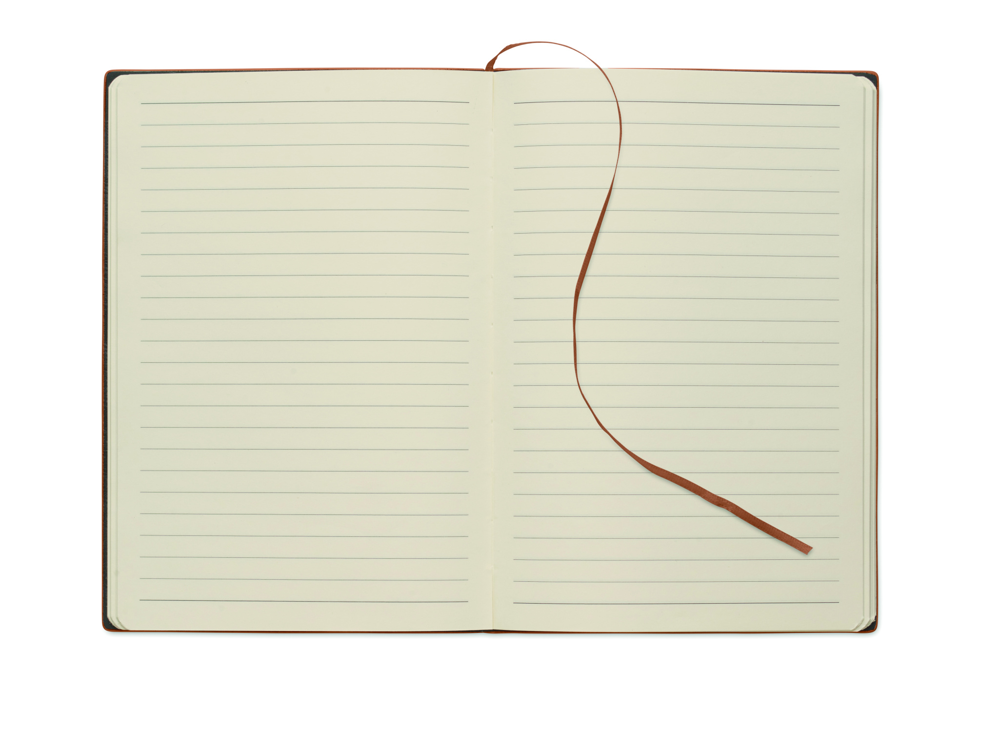 A5 notebook with soft smokey PU ribbed cover in 40% recycled post consumer and 60% PU with plain PU patch. 160 lined pages, 70gsm recycled paper (80 sheets). Matching colour polyester ribbon page marker.