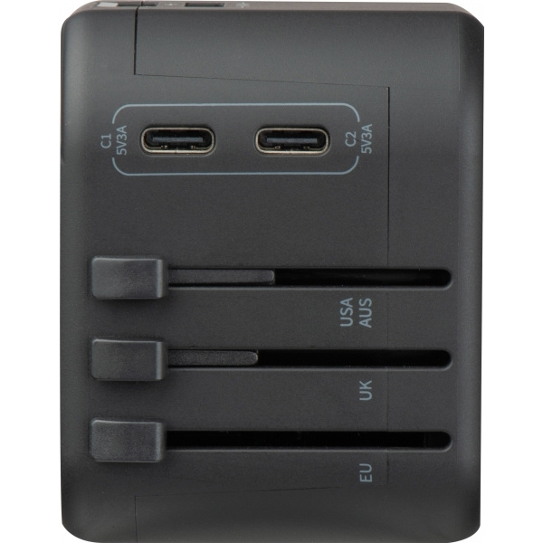 Адаптер для путешествий из пластика с 2 портами USB и 2 портами USB-C. Адаптер включает вилки для ЕС, Великобритании и США. Чехол обеспечивает практичное хранение в любой сумке. Компактный и универсальный для использования электронных устройств по всему миру.
